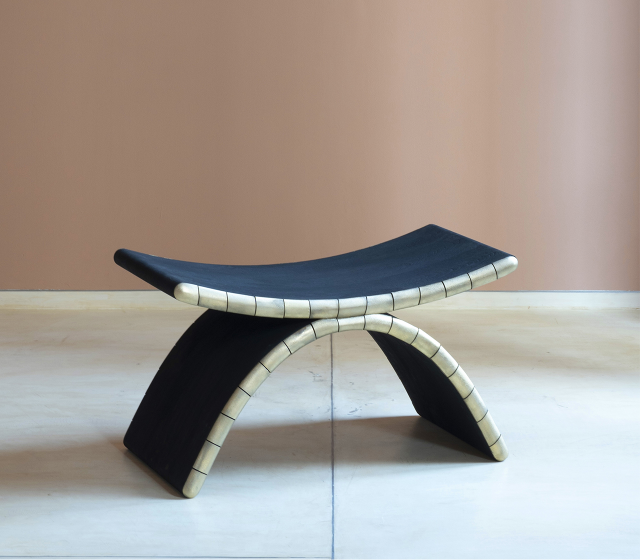 Made of burnt teak wood hand-carved into the near primordial chairs, benches and stools, the second Tarang collection puts the imperfection of the manual process—acentuated by a bronze overlay—on full display. But again, this gesture is confined in geometric form.