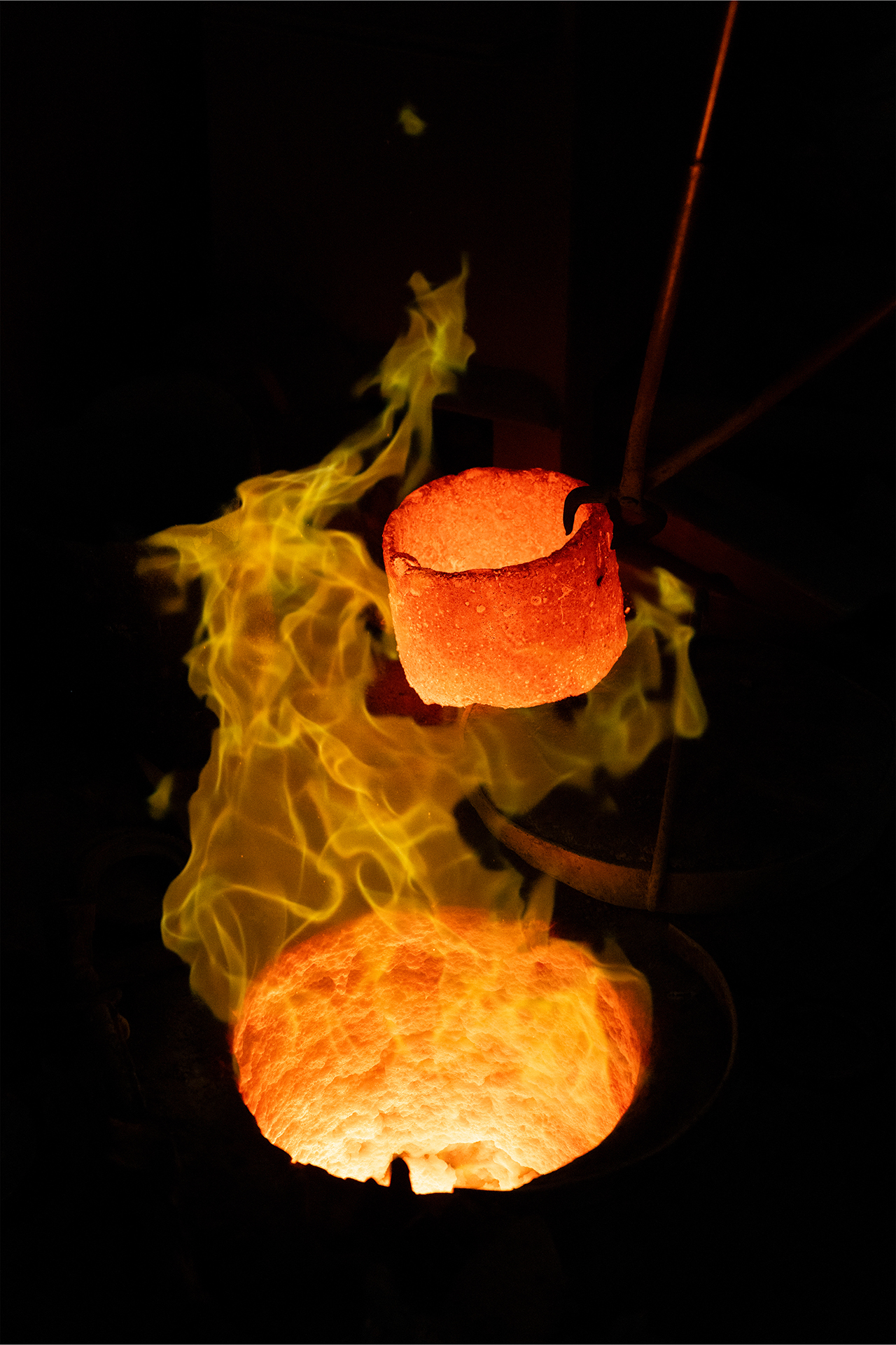 Noted designer Kelly Wearstler—whose prolific and often experimental practice has occasionally sparked broader conversations around authorship and influence in contemporary design, while maintaining a sizable and impressively experimental oeuvre of her own ideation—developed the new Lahar and Tarang capsule collections along these lines. Through intensive periods of on-the-ground residencies, she worked closely with artisans specialized in glass enameling, bronze casting, and burnt teak carpentry. And while their names might not be explicitly uttered, their prowess is fully celebrated; made the star of the show in new, unexpected ways.