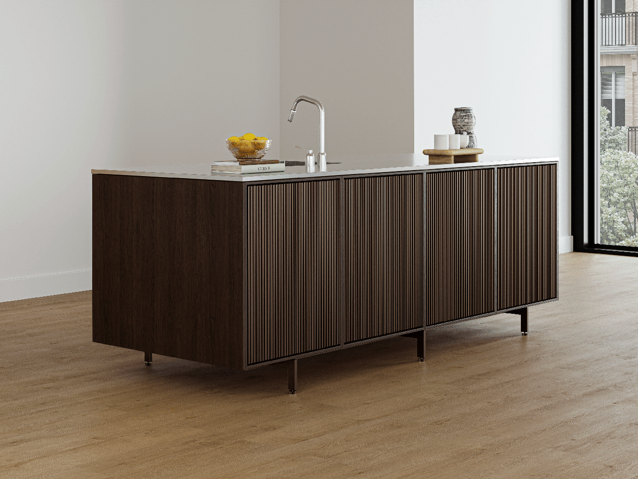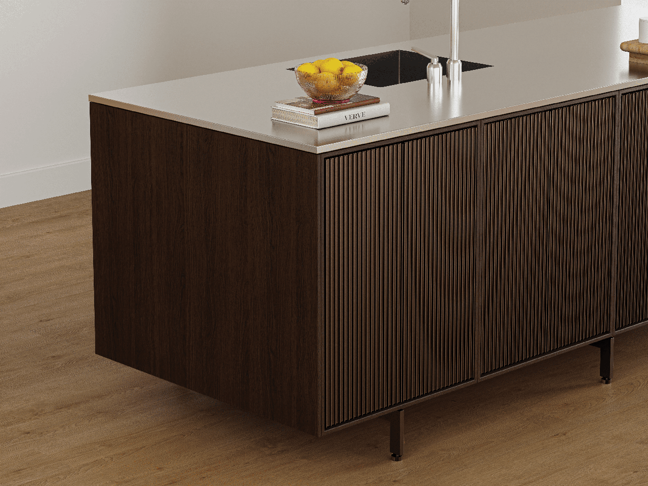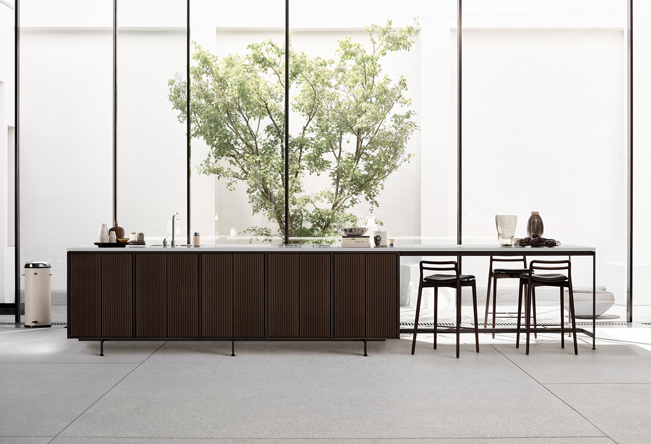 In an unexpected turn, it’s actually the wood that forms the shell of the particularly slender cabinet and counter island system. Metal is implemented as the base structure but also as accents: the thin legs, cabinet push-click pulls and anodized aluminum and doors; rendered in an extruded, low relief fluted pattern. Borrowed from sister product, the V3, this distinctive feature imbues the design with a clean, repeated vertical rhythm of form and shimmering light refraction.