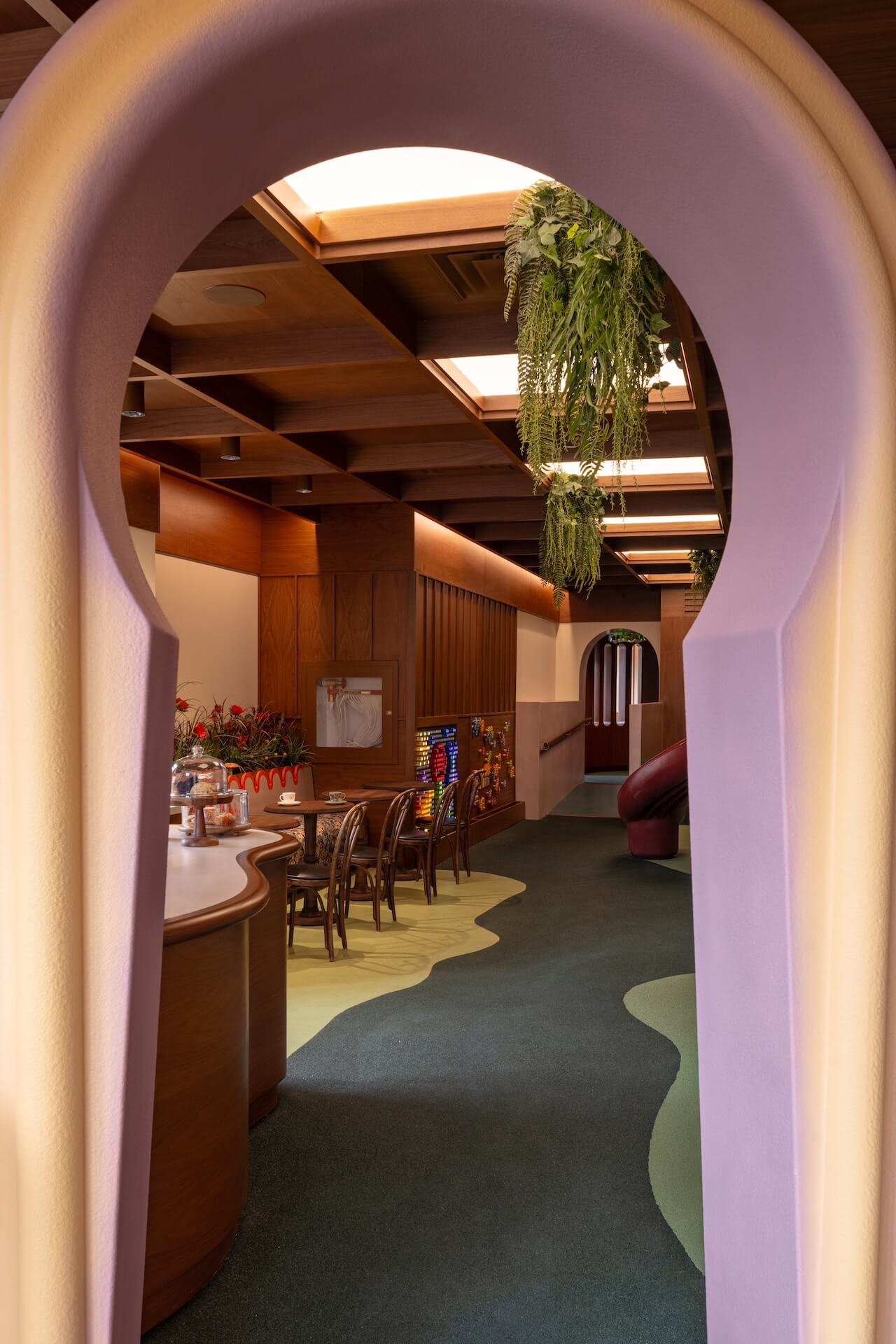 The play zone is just as thoughtfully designed as the front of shop – no garish game signage, here. Just a wonderfully crafted space for kids to explore, featuring Lite Brite walls, green foam steps and a cherry-red slide.
