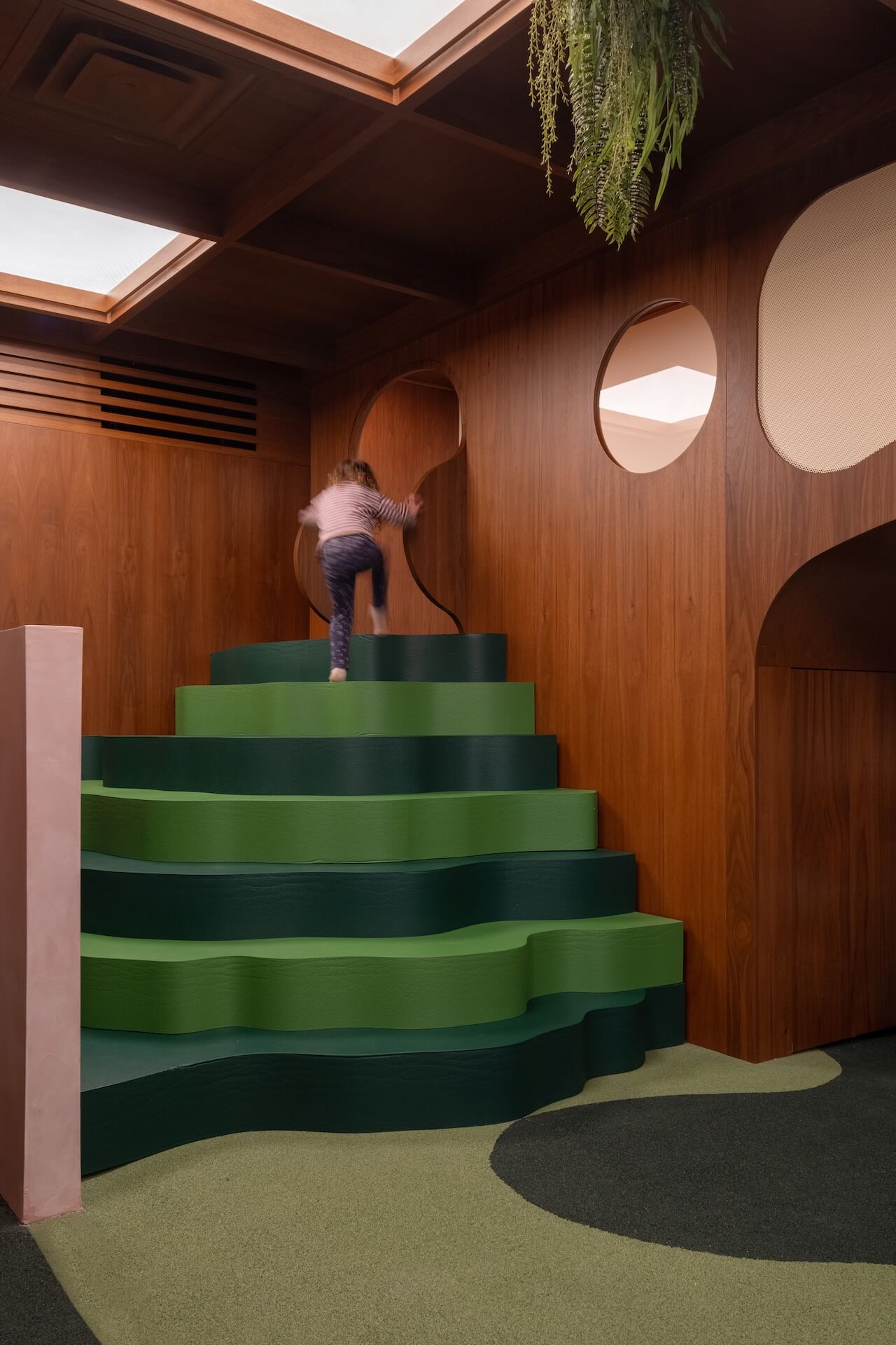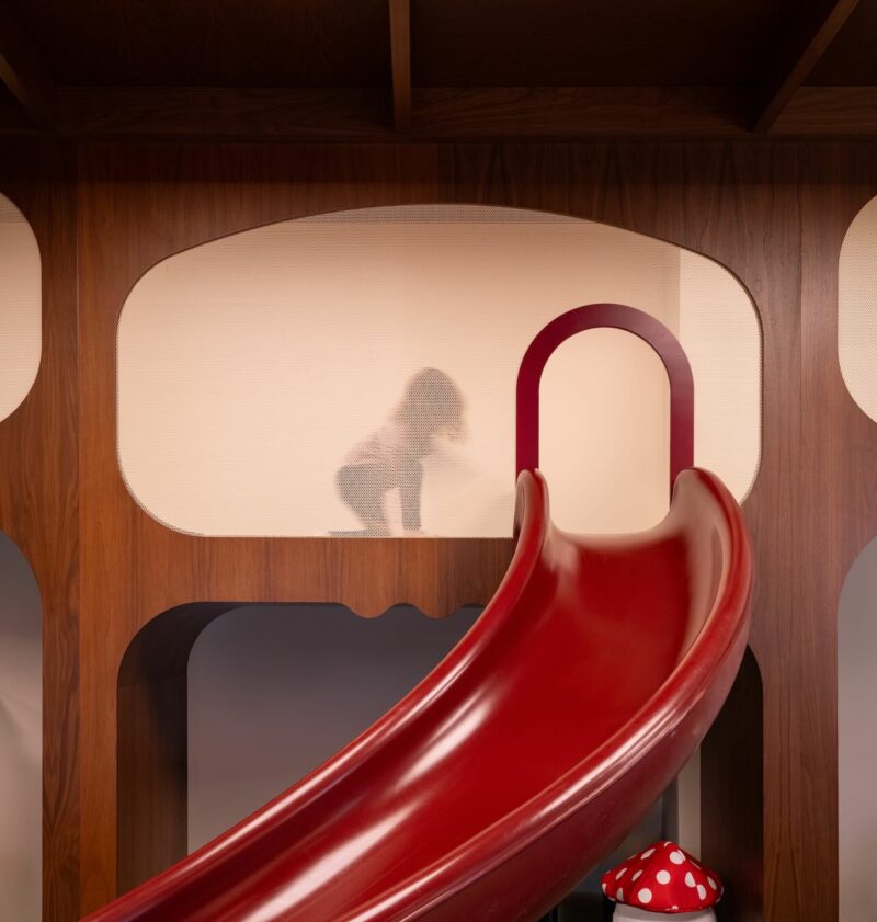 And everything was designed for safety, from the rubber flooring to the sculptural foam steps and the climbing and sliding elements that activate the two-tier play structure, where mesh-filled cutouts provide peek-a-boo spots for kids on the second level.