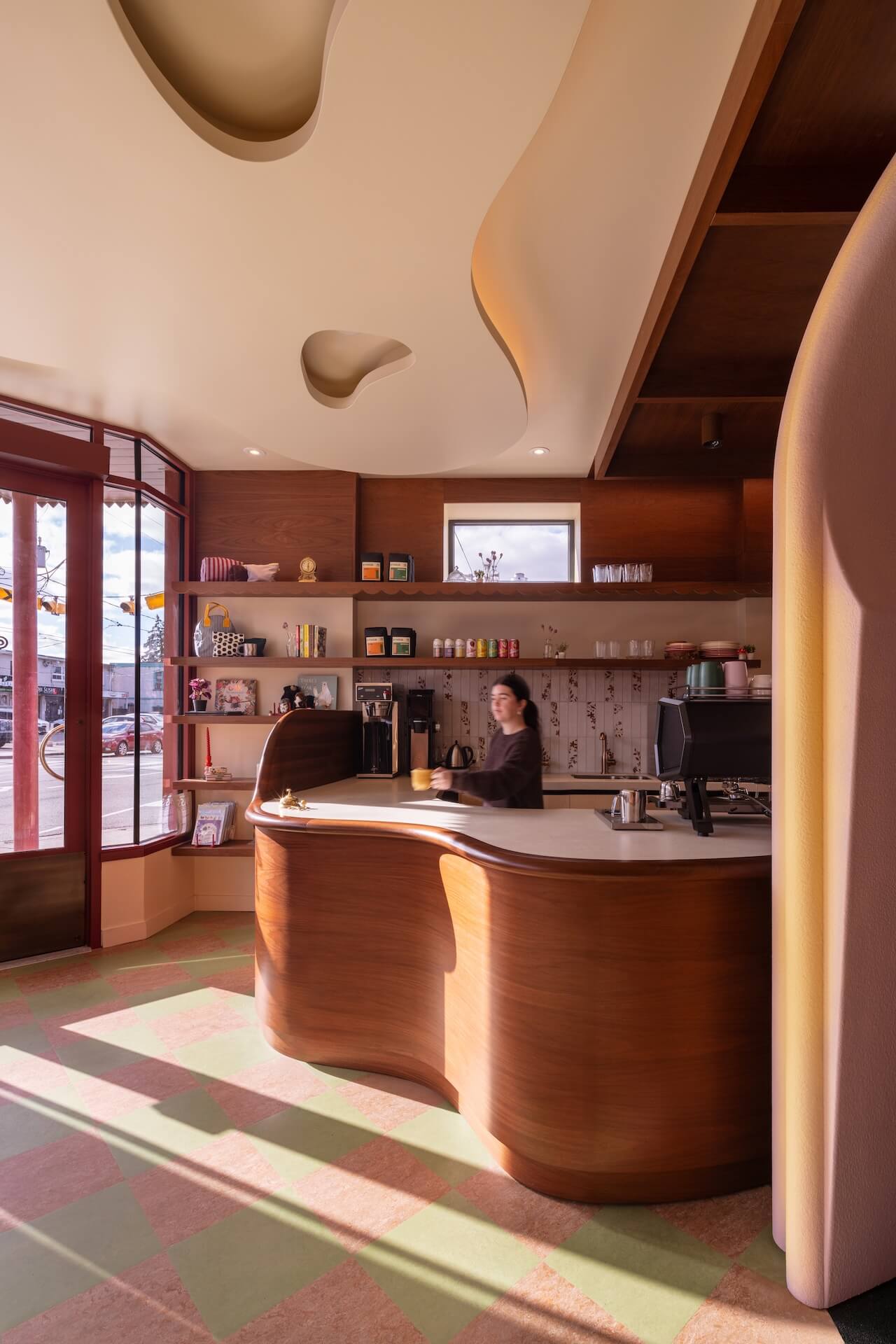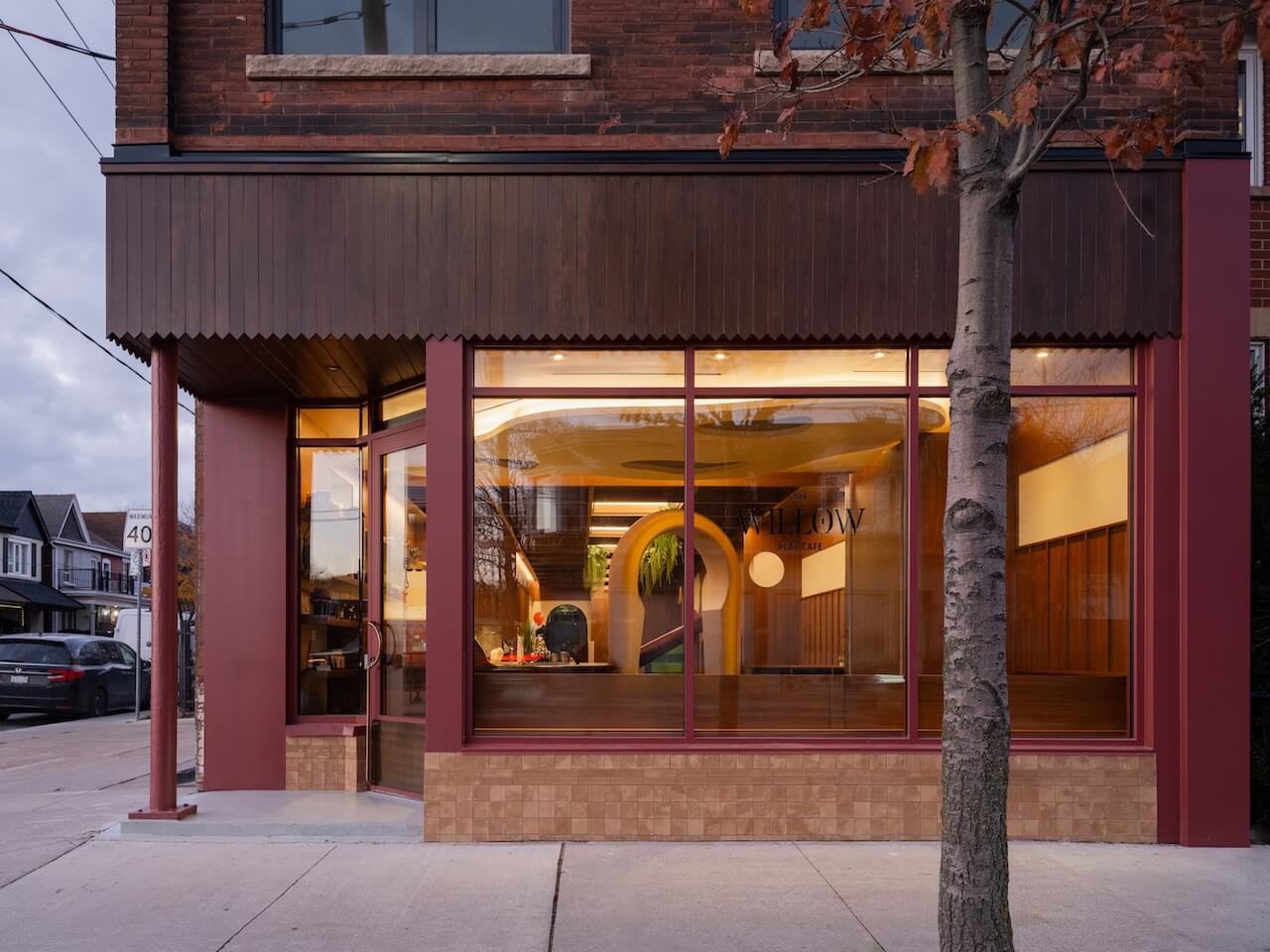 The Willow Play Cafe, in Toronto’s Junction neighbourhood, is a hybrid of sophistication and whimsy. Local practices Denizens of Design and DS Studio transformed a dive bar into a warm, inviting coffee spot – with wood panelling, a coffered ceiling, checkerboard linoleum flooring, vintage bentwood chairs and soft lighting – that morphs into an Alice in Wonderland setting through a keyhole-shaped portal.