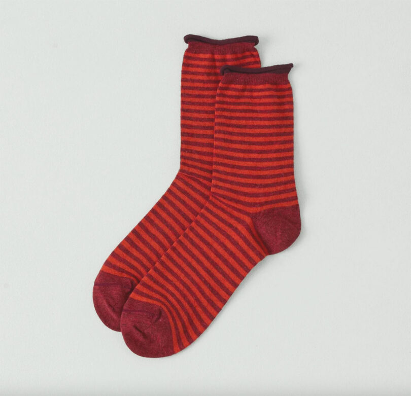 Beautiful in Berry, super soft, and just the right color for the season, these cashmere-cotton blend socks from TOAST are the perfect way to keep warm through winter’s remaining months. Each are knitted with recycled nylon for stability while perfectly pairing neat stripes, a contrast toe and heel, and rolled cuff. A good pair like these is unmatched – warm some up by a fire, slip ’em on, and see what all the fuss is about.