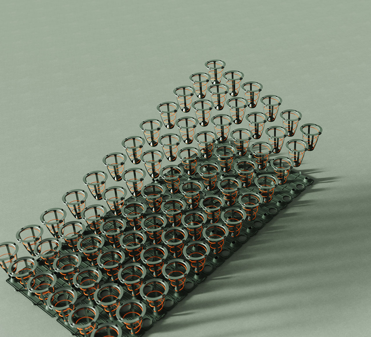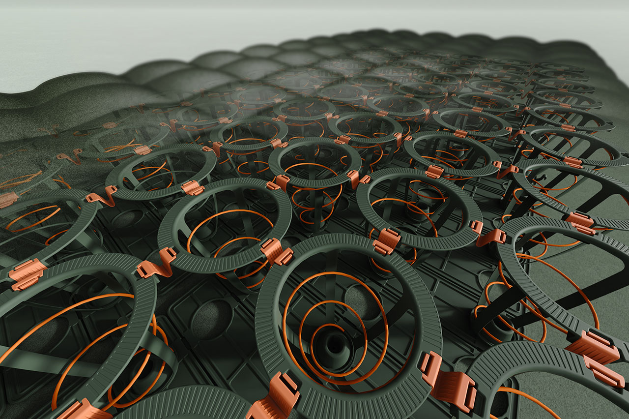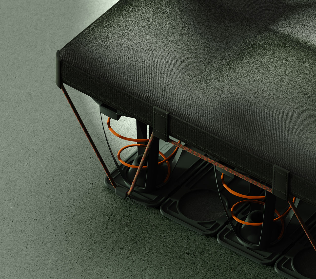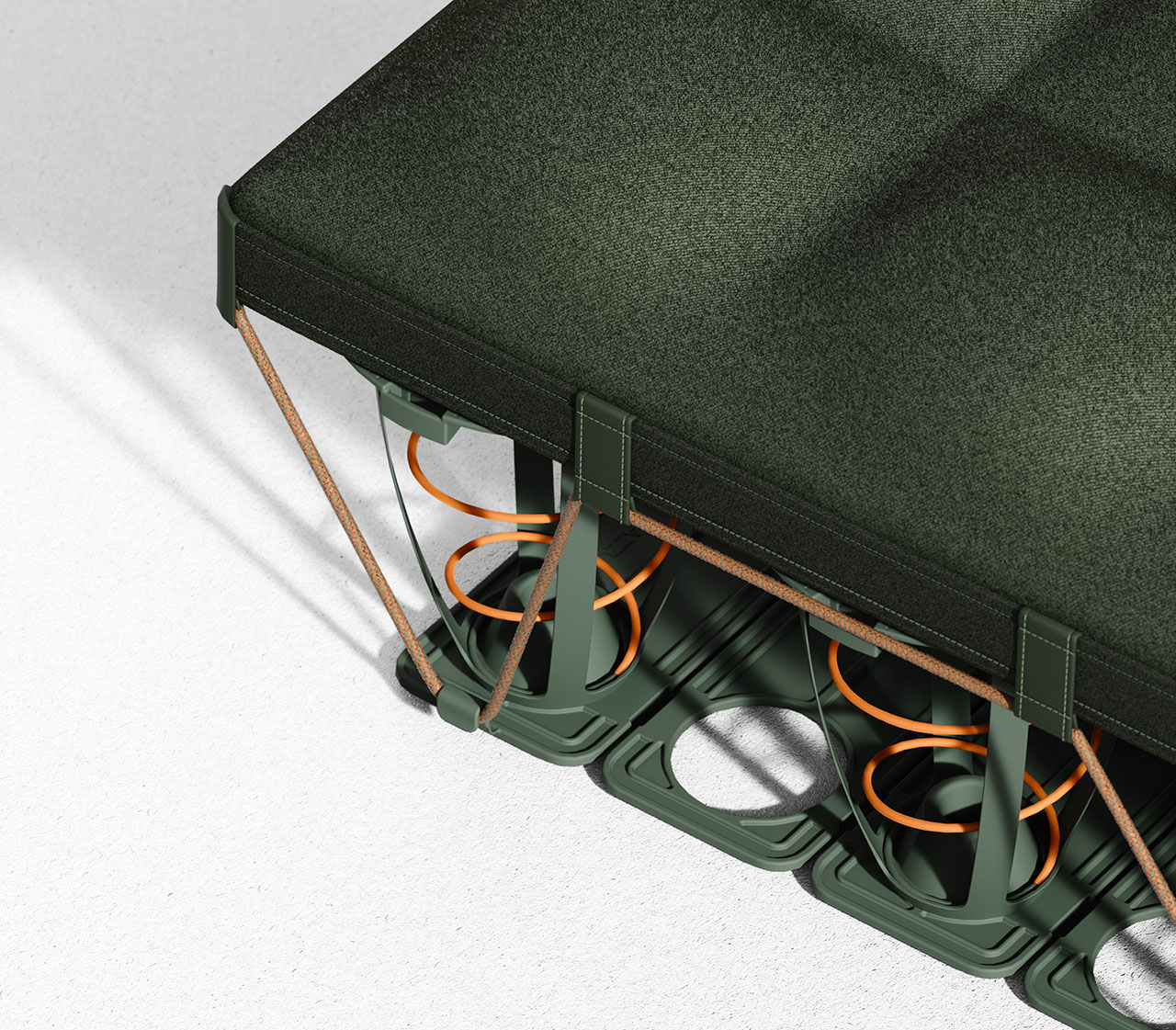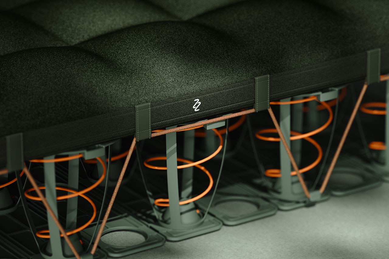 The individual elastic spring units – comprising precision-engineered, pre-compressed coils – are encased in durable jackets. The modules snap-fit together and come with paracord lashings. The currently available single palette configuration is made up of 72 of these and is fitted with a slim textile topper for additional comfort out in the wild.