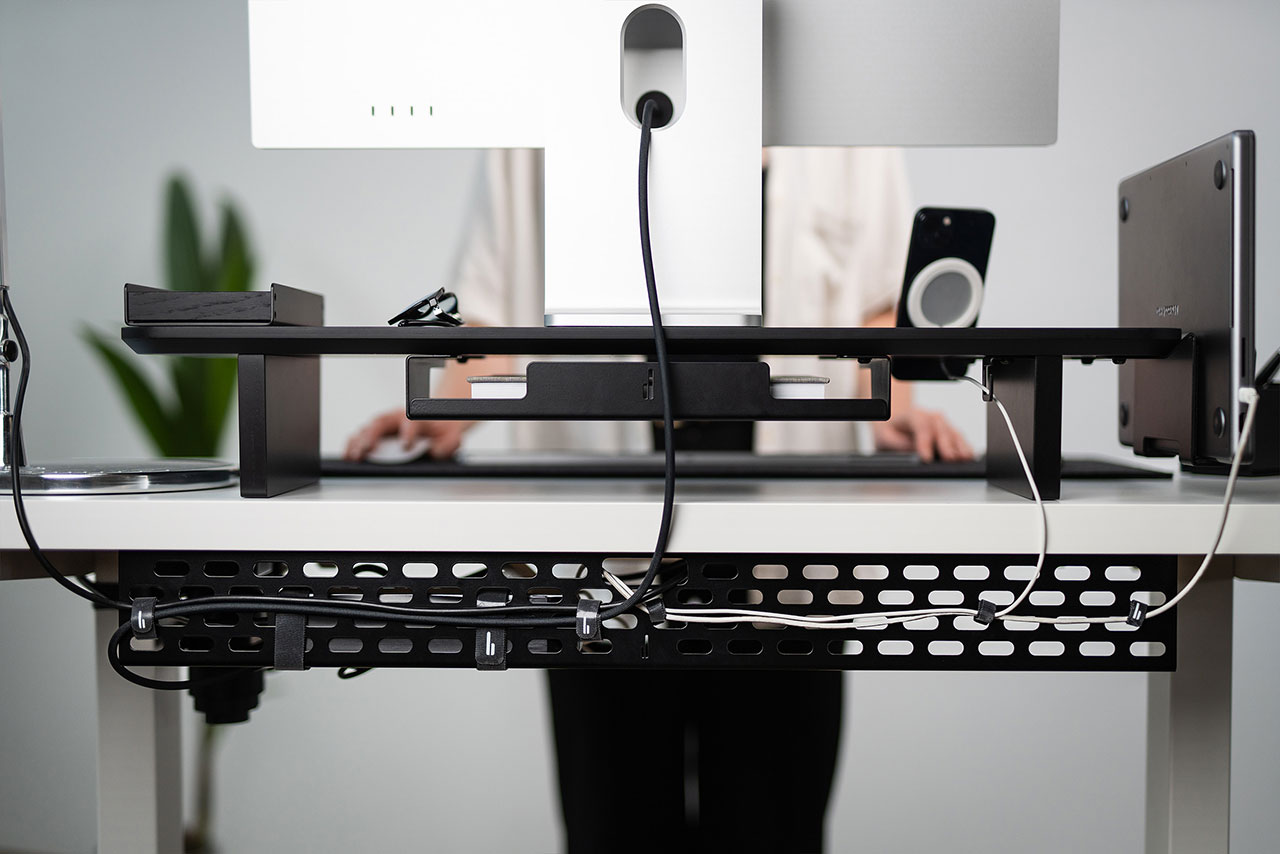 Developed by German manufacturer Balobo, the desk-mounted patform—primarily used to pedestal larger computer monitors—turns an environment too-often defined by clutter and disorganization into a serene oasis for focused, well managed work.