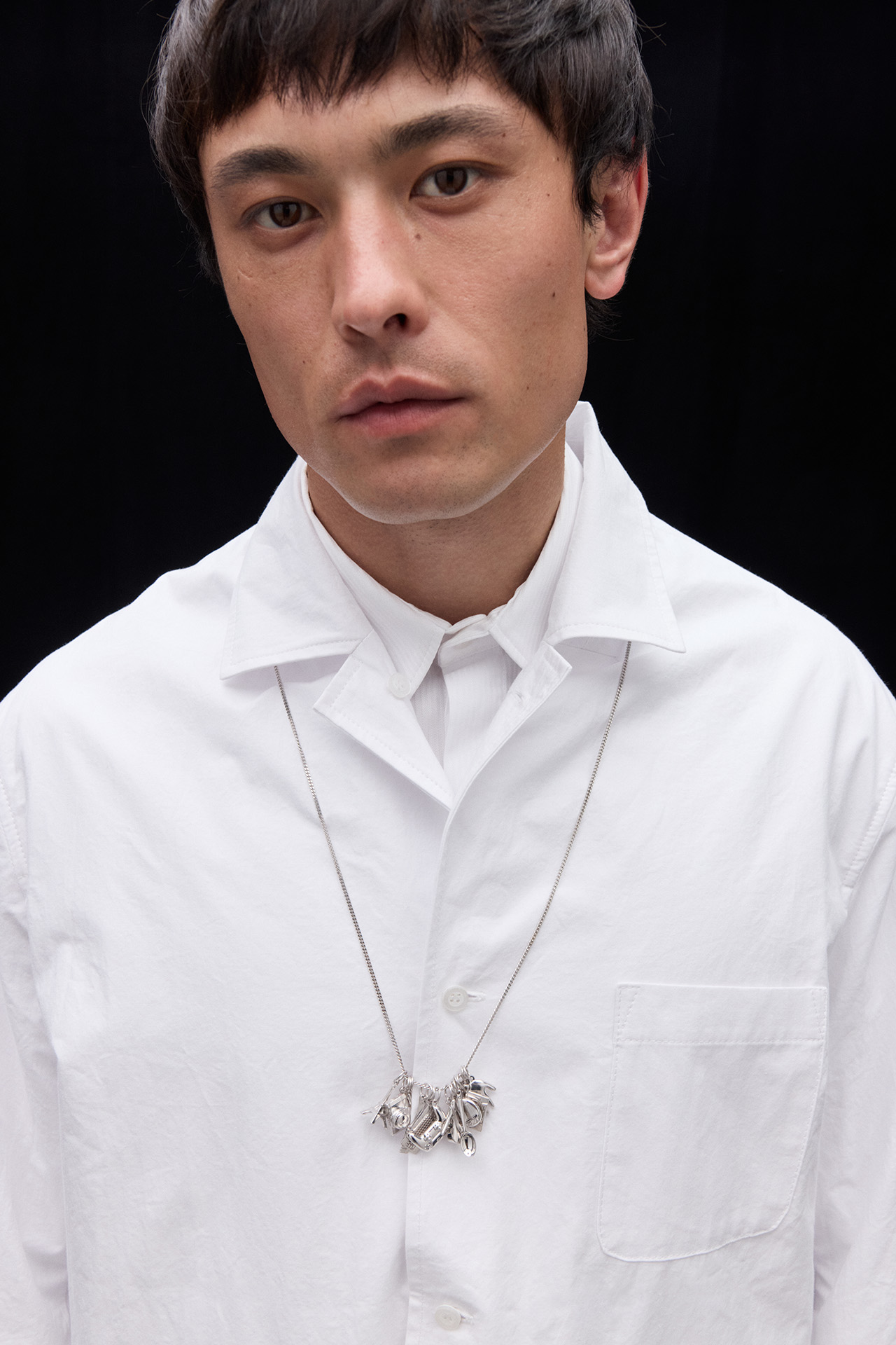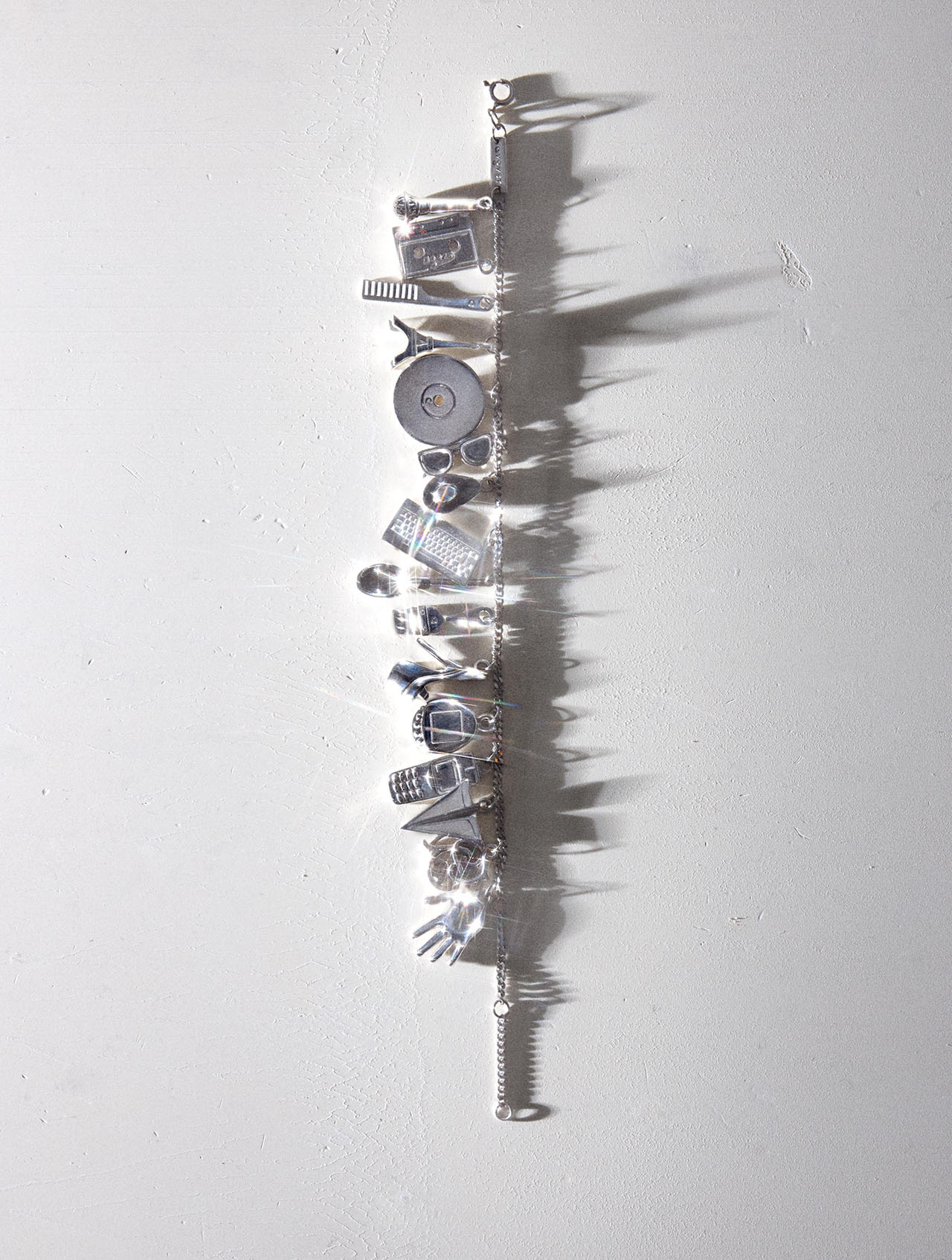 The creative synergy is focused on the ready-made tradition – or what Nuriev calls “Transformism” – turning everyday items, familiar artifacts, and the typically mundane, into striking pieces of artful jewelry with subtle irony. Small but mighty, the charms take center stage as the collection’s hero in the 16 Trinkets Bracelet. Otherwise, pendants may be hooked on a chain or earring, and placed wherever you desire.