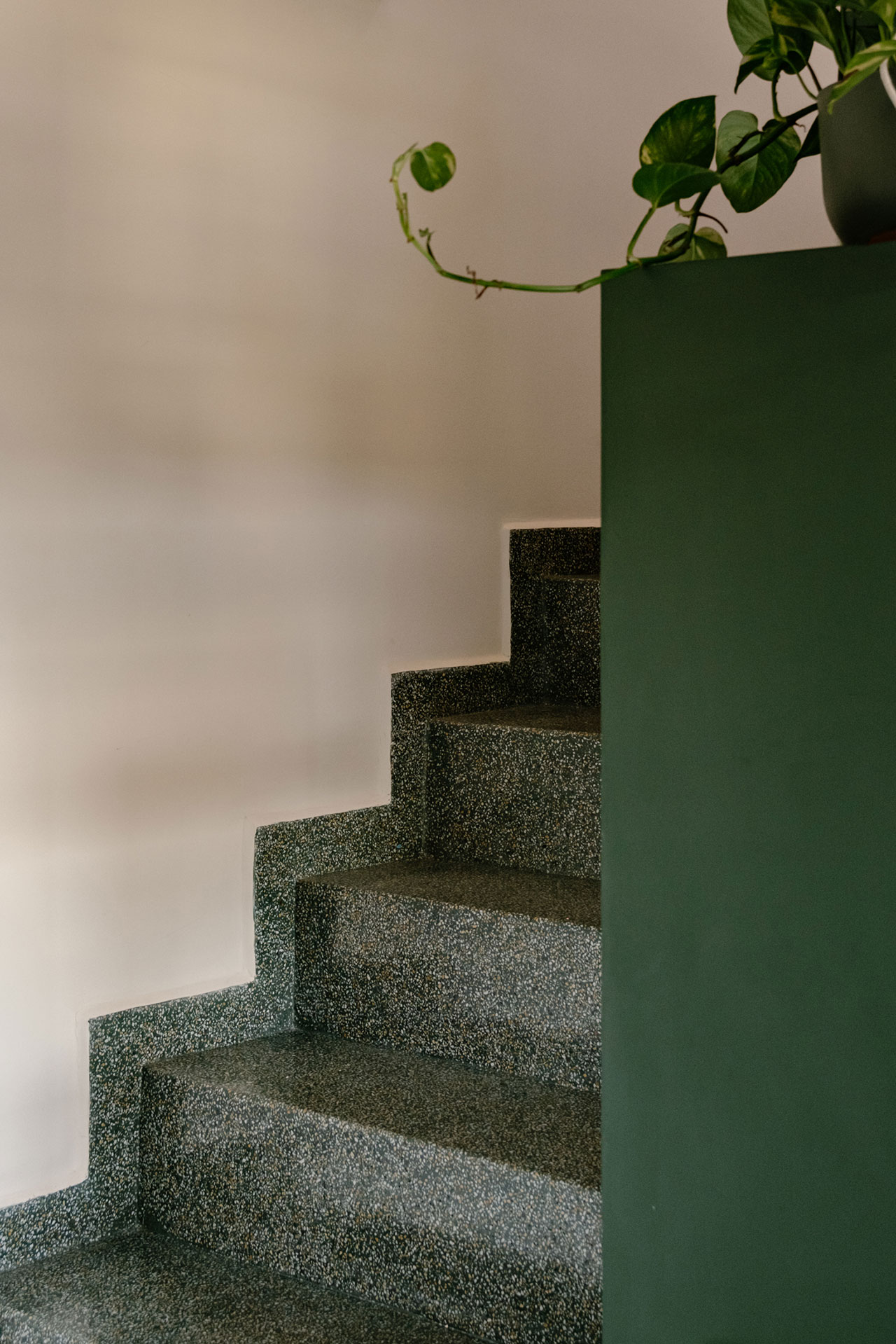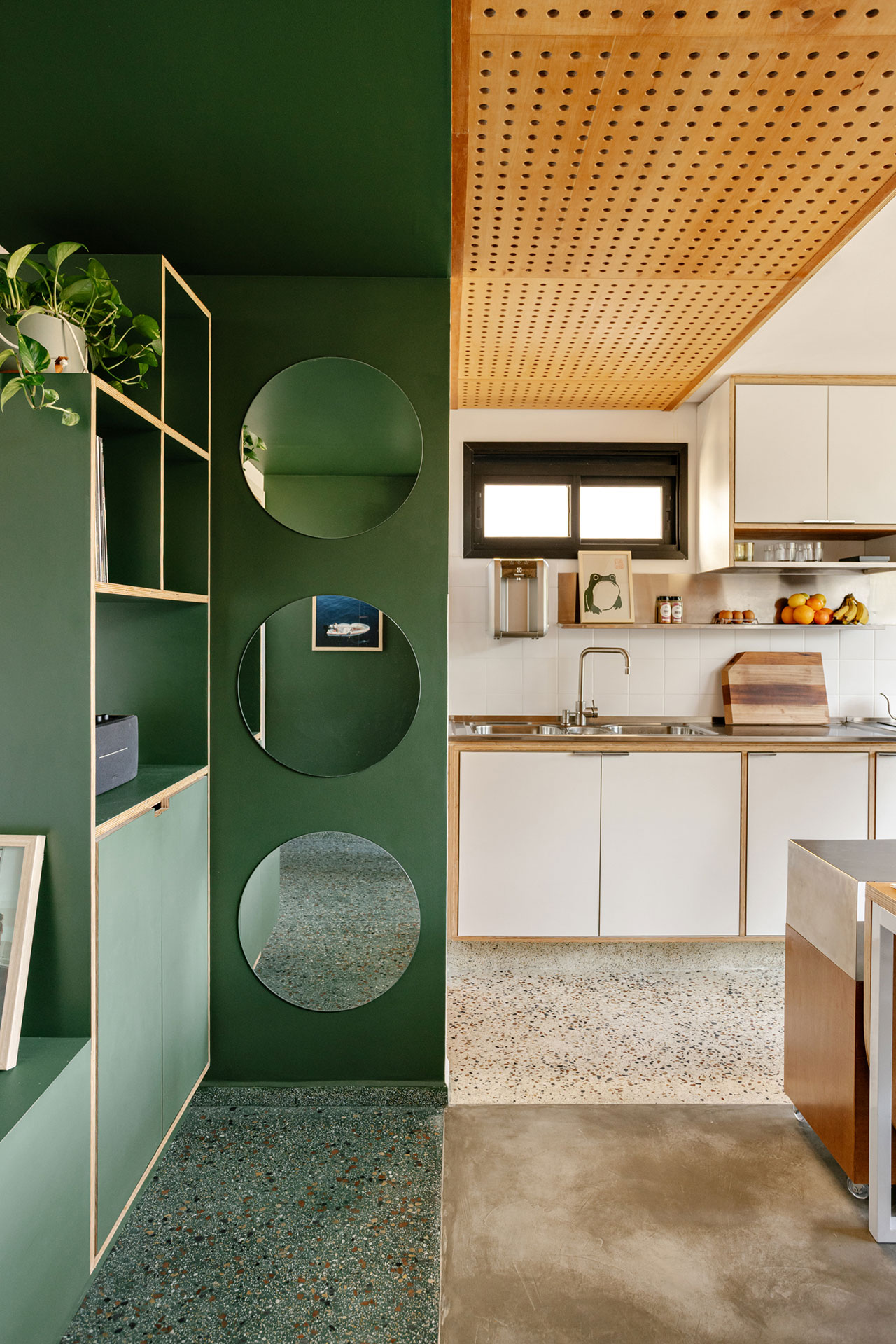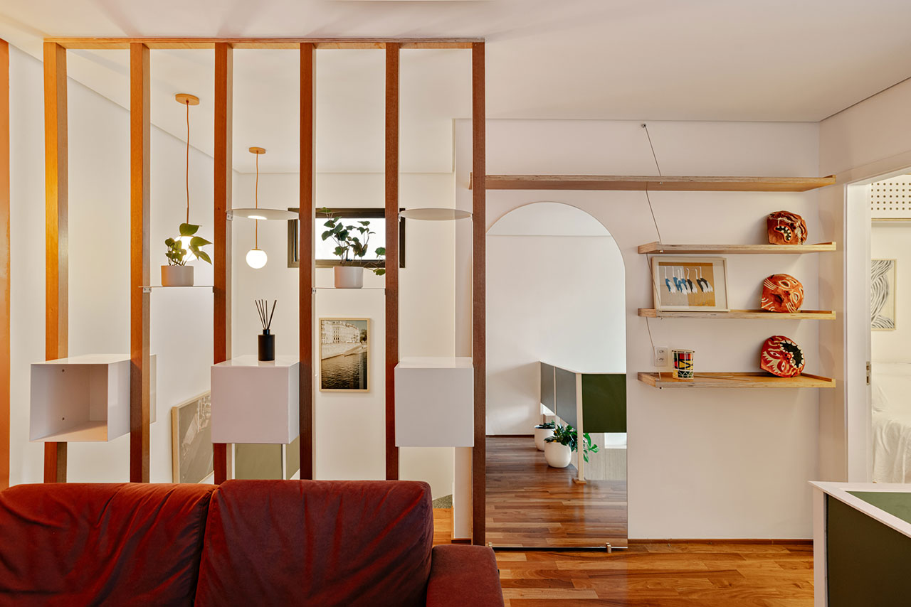 The entry sets the tone immediately. A saturated green envelopes the threshold and pulls you inward, flowing from floor to walls and even overhead, so that moving through the apartment feels guided rather than simply walked. Storage is incorporated into arrival through a finely detailed wooden screen that hides everyday clutter while still letting light and air pass through. A low seat and built-in compartments make pausing, dropping a bag, or choosing a record part of the ritual of coming home. With the former balcony absorbed into the interior, the ground level reads as one long, open plane instead of a series of chopped-up rooms.