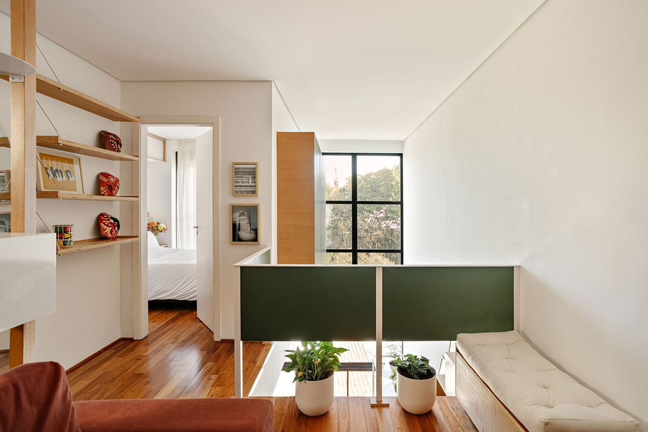 Looking up, the mezzanine floats above this open living area, lightly defined by a slim guardrail accented with green panels. The color palette warms with earthy wall tones and honey-colored wood floors that create a relaxed zone for watching films or reading. Instead of solid walls, a slatted divider filters sightlines and sunlight, allowing privacy without sacrificing brightness. Shelving and mirrors along the circulation path add moments of reflection and depth, making the narrow passage feel animated rather than tight.