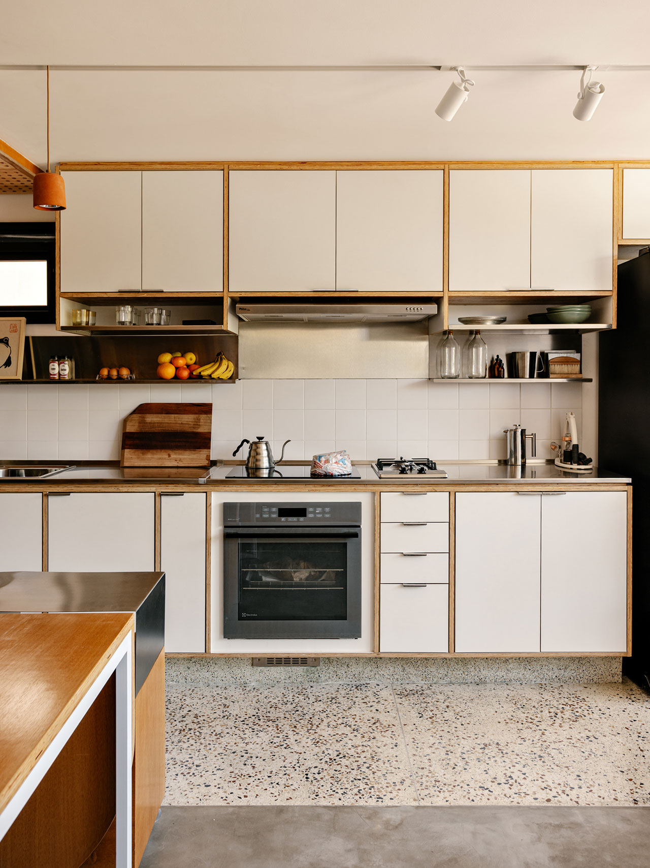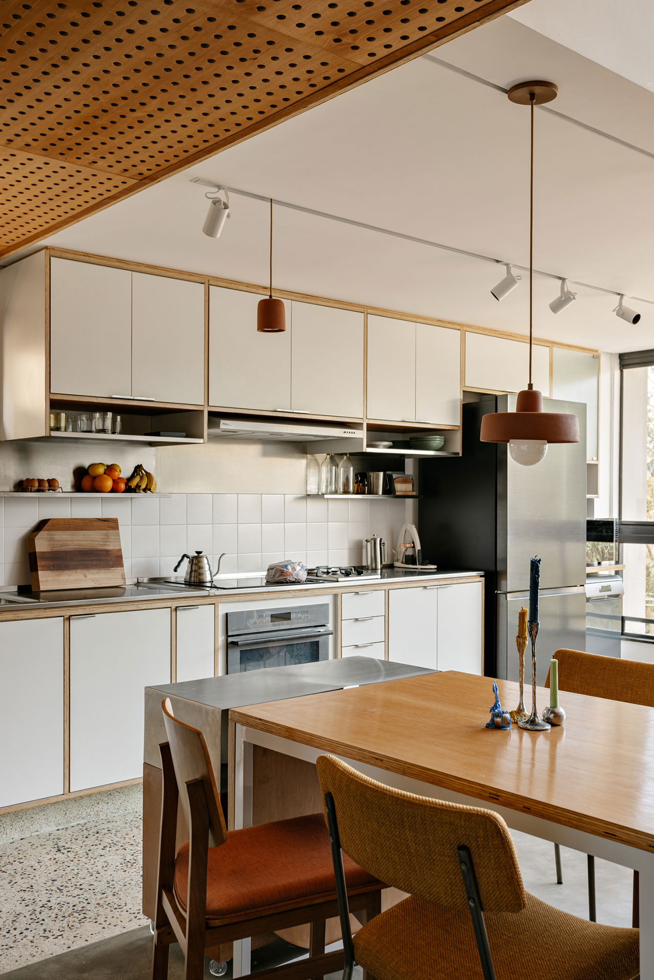 A statement piece of furniture was designed to do multiple jobs. A custom table slides and expands, shifting between prep station, dining surface, and worktop depending on what the day requires. Around it, the kitchen has the directness of a studio workspace with pale cabinet fronts reveal their plywood edges, while steel surfaces reflect light and keep things visually sharp. Subtle changes underfoot replace walls as the main organizers of space – one finish for cooking, another for lounging, and lastly one to signal movement through the apartment – so the eye understands where each activity belongs without a single partition rising up.