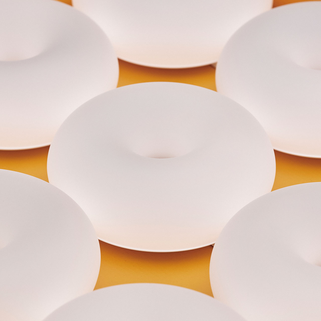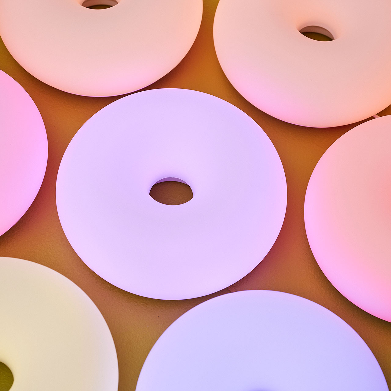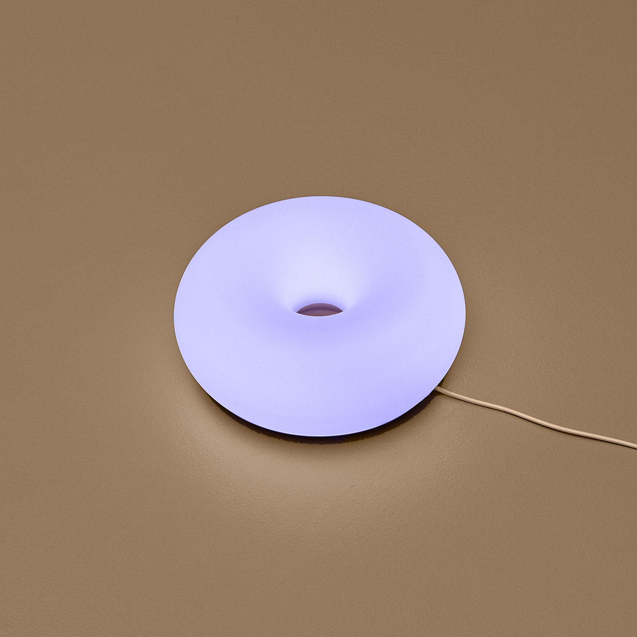 Universally understood in its geometry, the original donut lamp paired a warm amber-orange glow with a glossy glass exterior that caught and reflected ambient light. In this next chapter, the sculptural silhouette remains intact, but the experience shifts. The new smart donut introduces a soft, matte white glass finish that diffuses light from within rather than bouncing it off the surface––a subtle yet meaningful evolution in how the form interacts with its surroundings.
