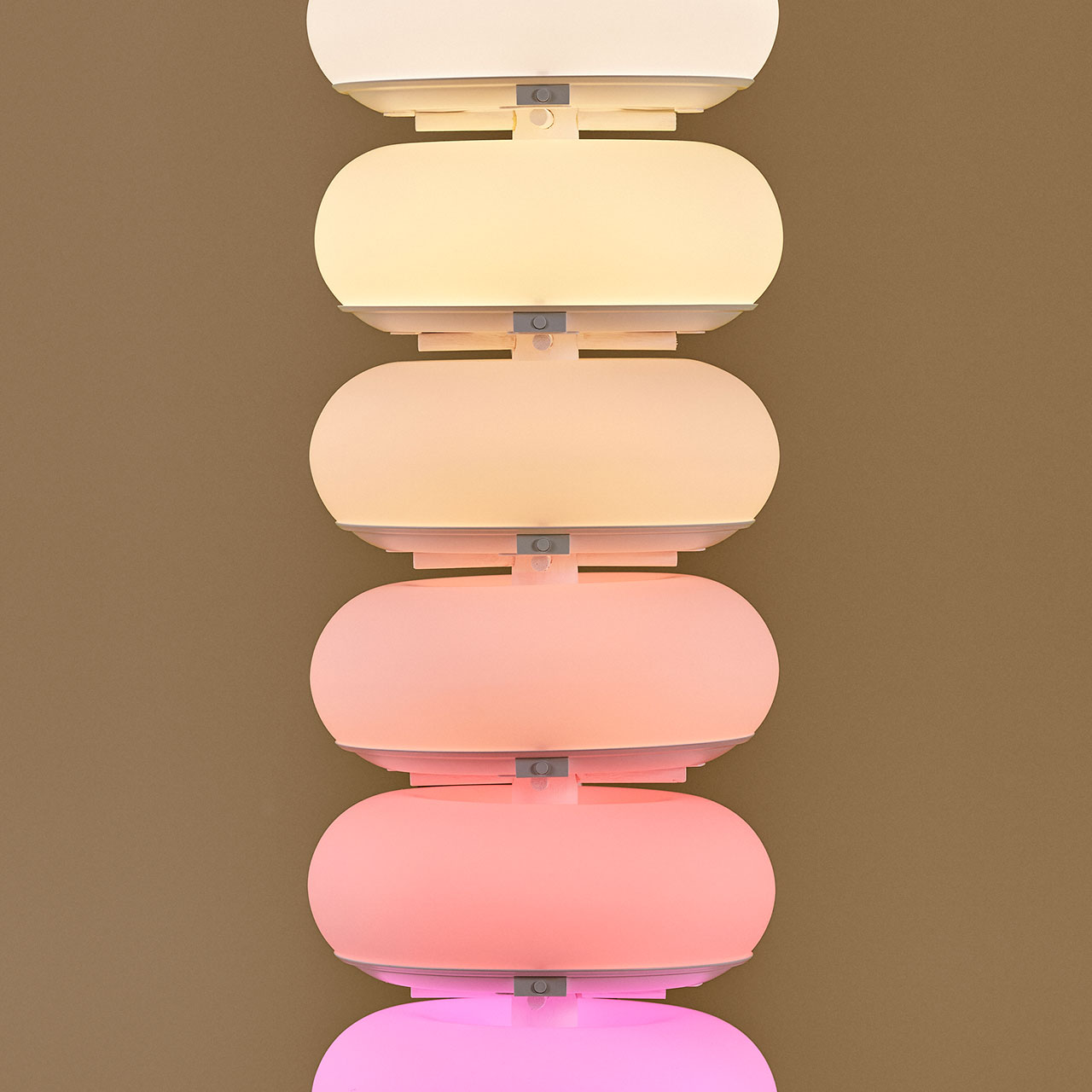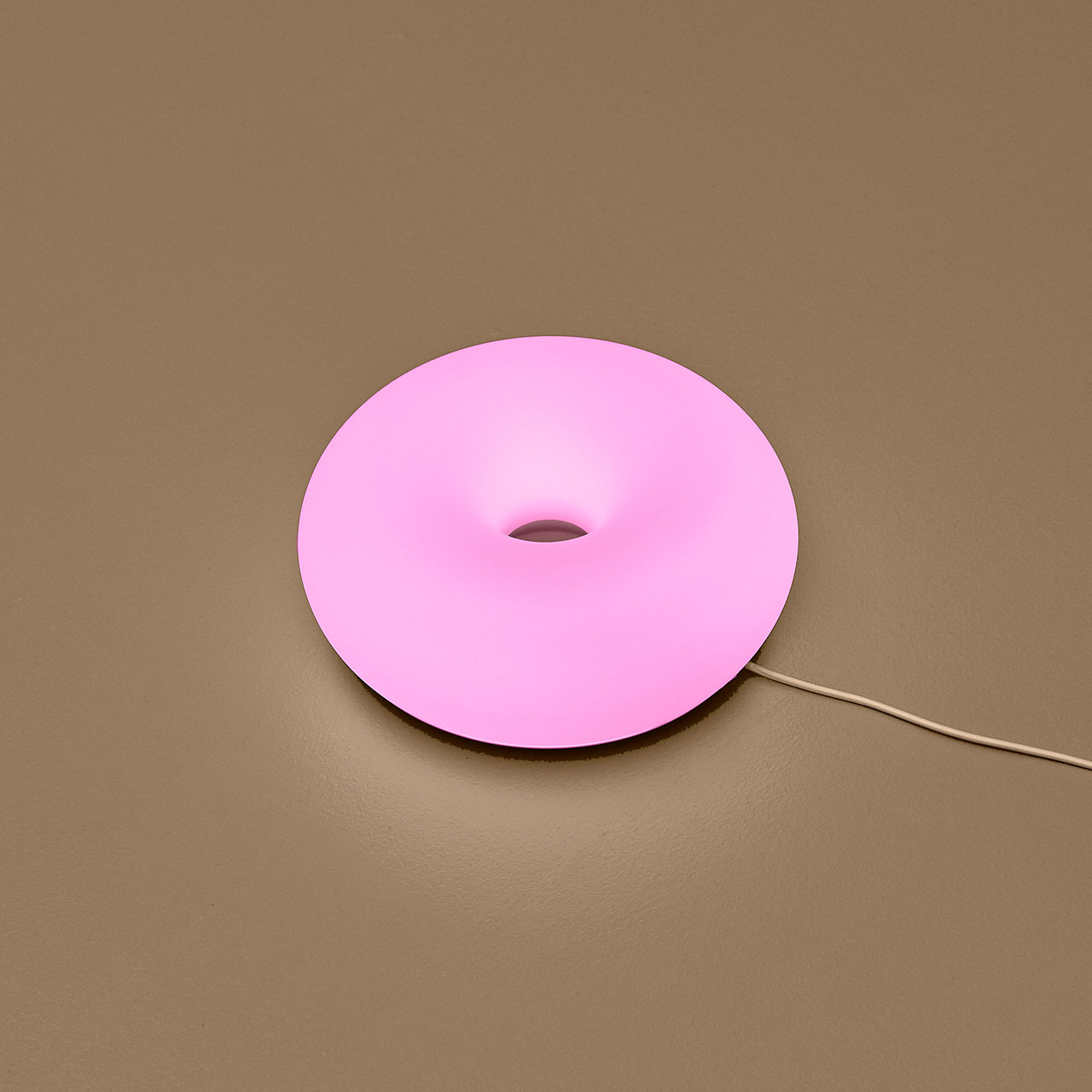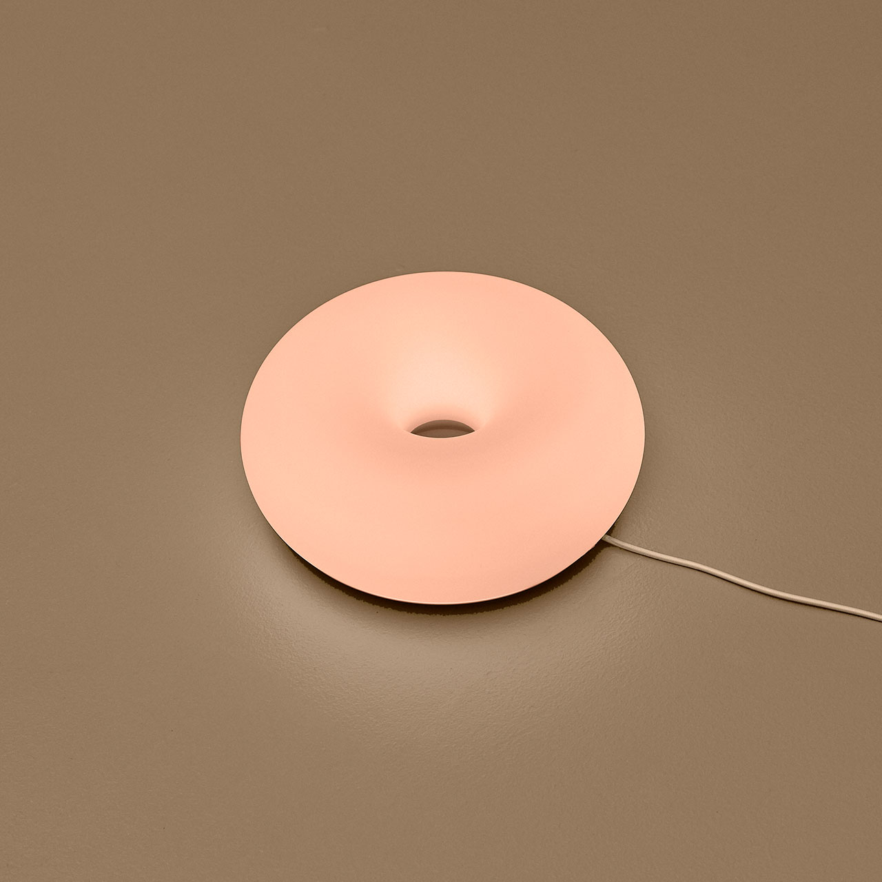 Universally understood in its geometry, the original donut lamp paired a warm amber-orange glow with a glossy glass exterior that caught and reflected ambient light. In this next chapter, the sculptural silhouette remains intact, but the experience shifts. The new smart donut introduces a soft, matte white glass finish that diffuses light from within rather than bouncing it off the surface––a subtle yet meaningful evolution in how the form interacts with its surroundings.
