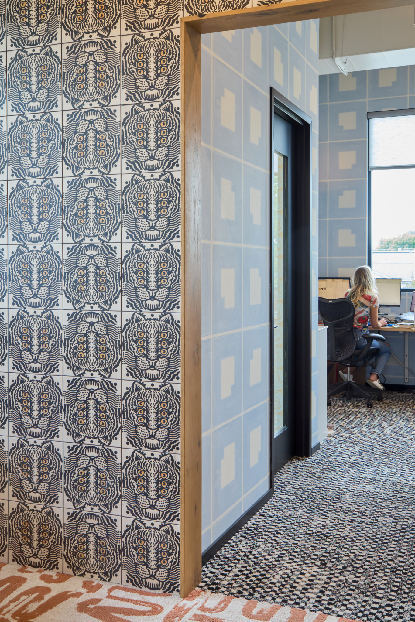 The marquee conference room is decorated with a bespoke wallpaper from New Hat, with hues and details inspired by Powell’s completed projects, each represented in its own rectangle. Greenery adds vibrancy throughout the workplace, while glass walls let light in and maintain a connection to the outdoors.
