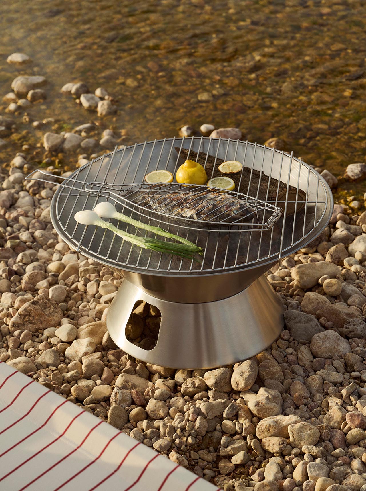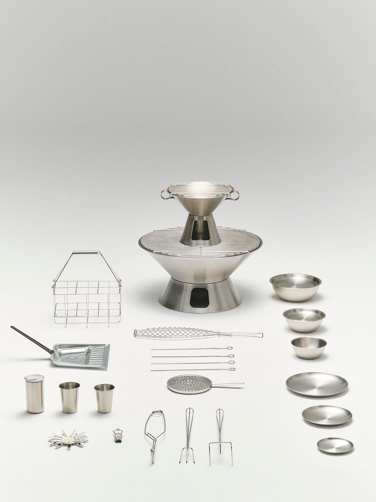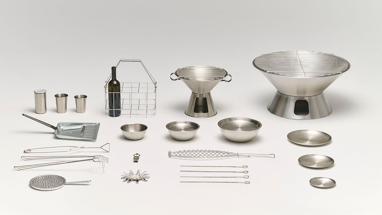 Alongside the more structural Canopy and Folding Tables are the Cooler, Bottle, and Picnic Bags. Formed like two intersection cones, the BBQ and Firepit products are as straightforward in their function as they are satisfying in their countered shape. The adjoining Plates, Pans, Grills, Tongs, Forks, and Skewers round-out the proposition. Bringing in that nostalgic feel are the Brooms and Dust Pan.