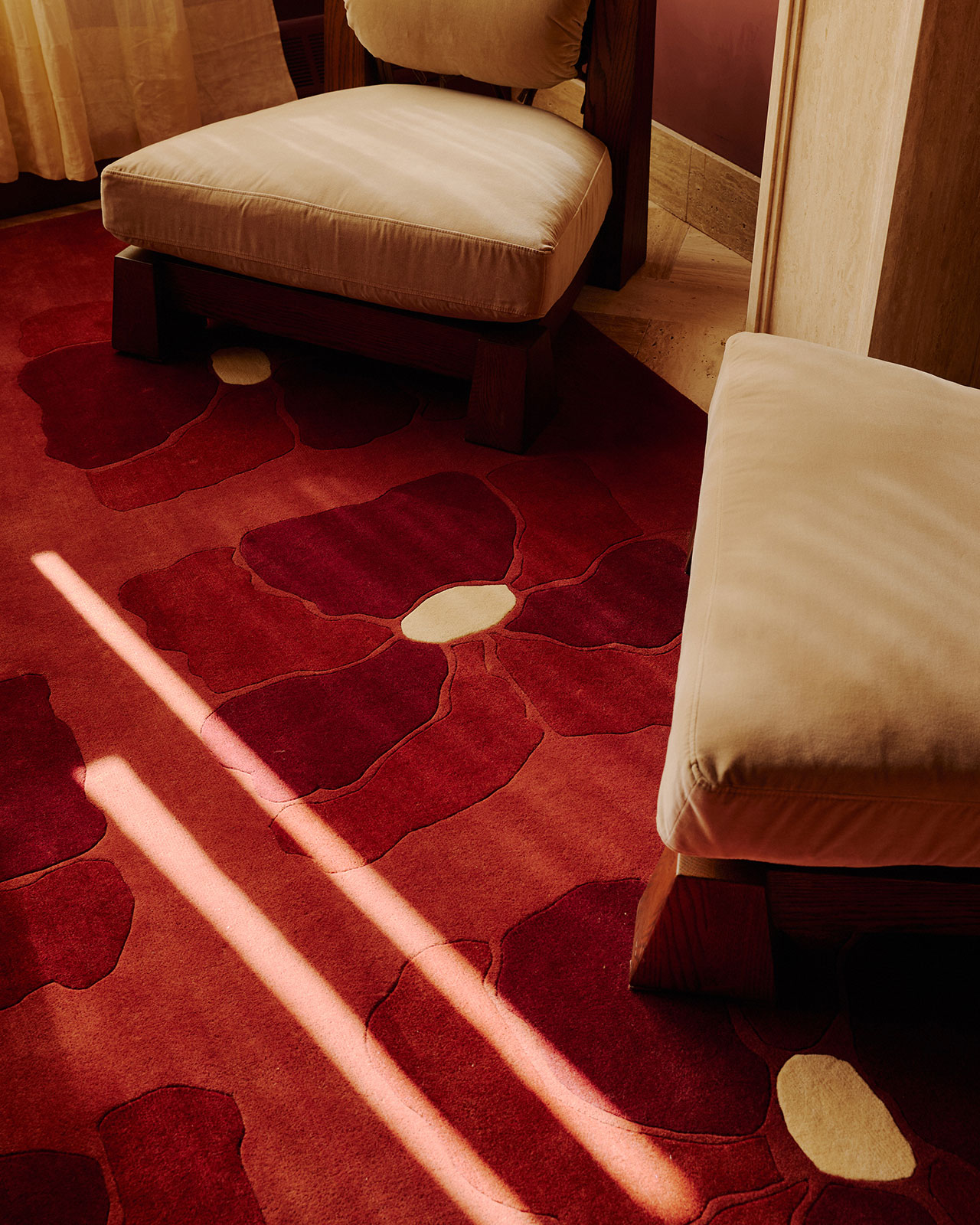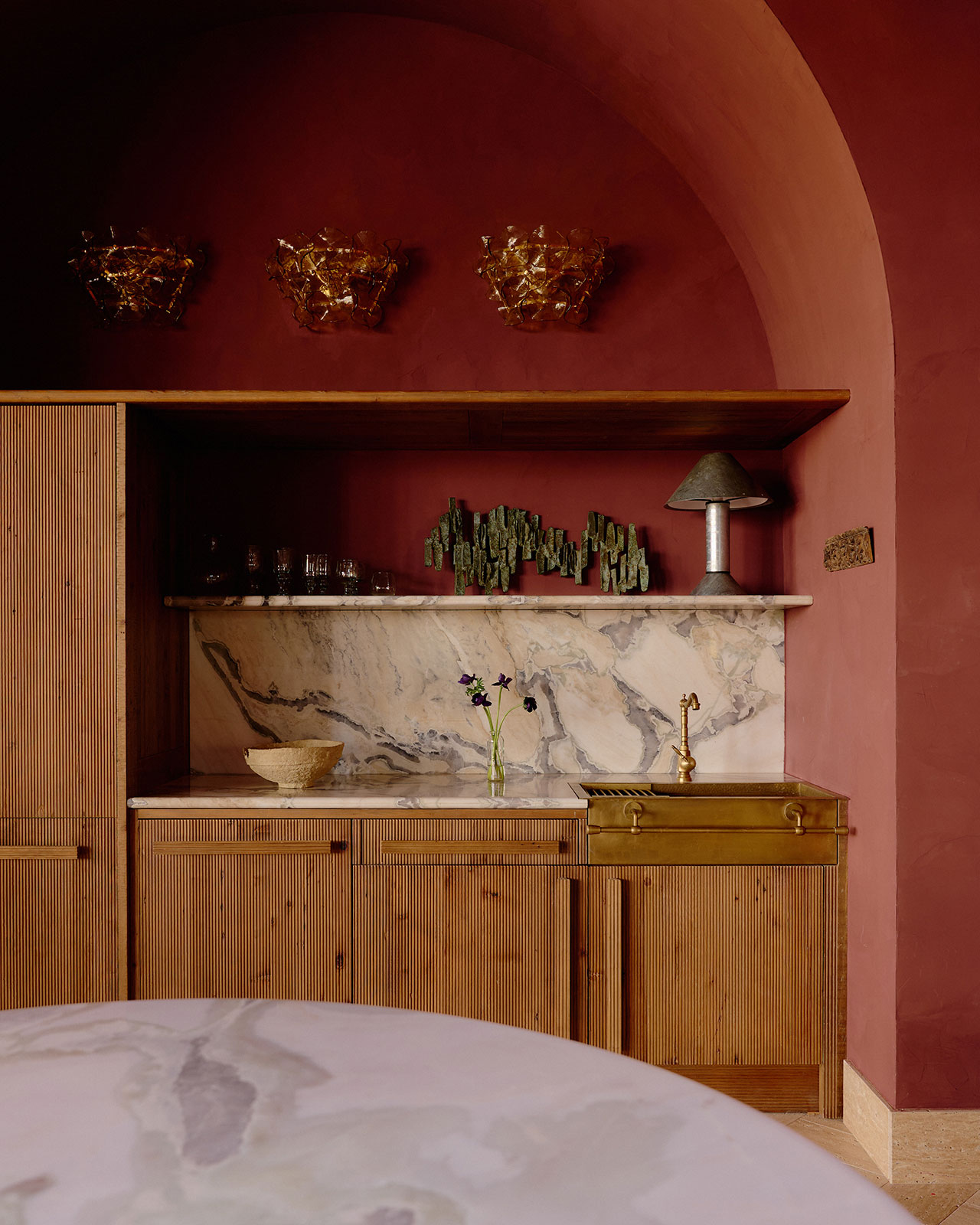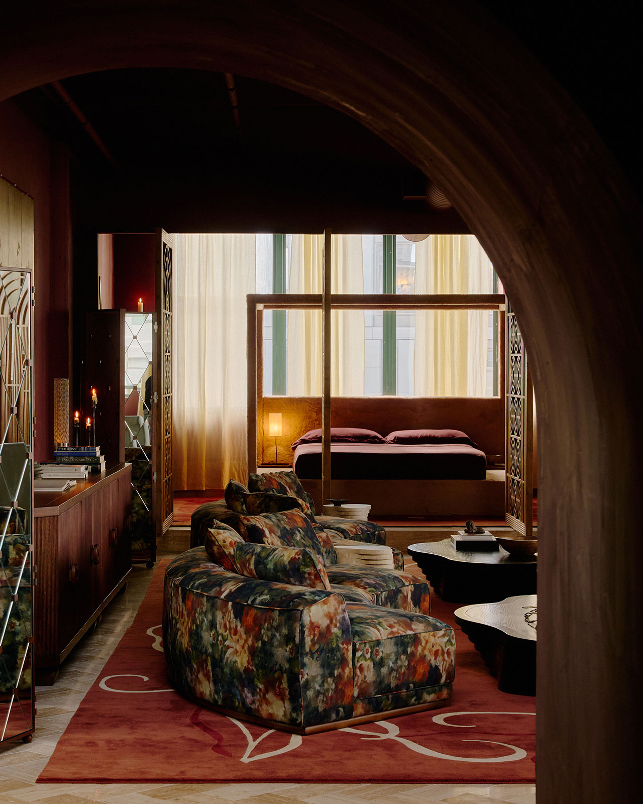 The orangey red found in the printed textile covers the walls in an almost stucco-like effect and carries across to subtly ornamented rugs. A dramatically staged lounge gives way to a platformed bedroom accessed through intricately detailed (concentric circle pattern) panel doors.