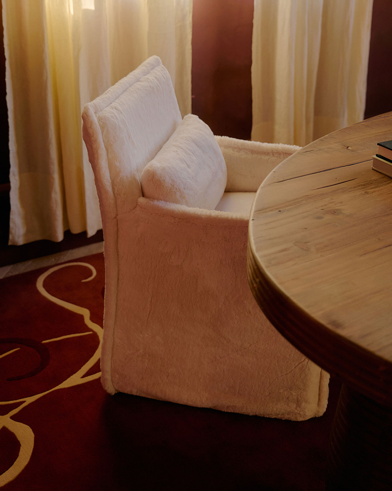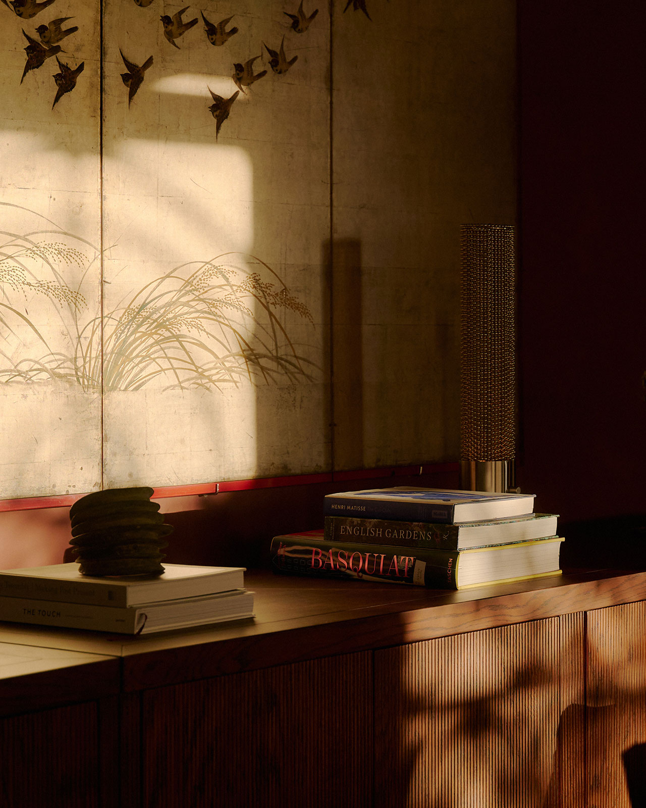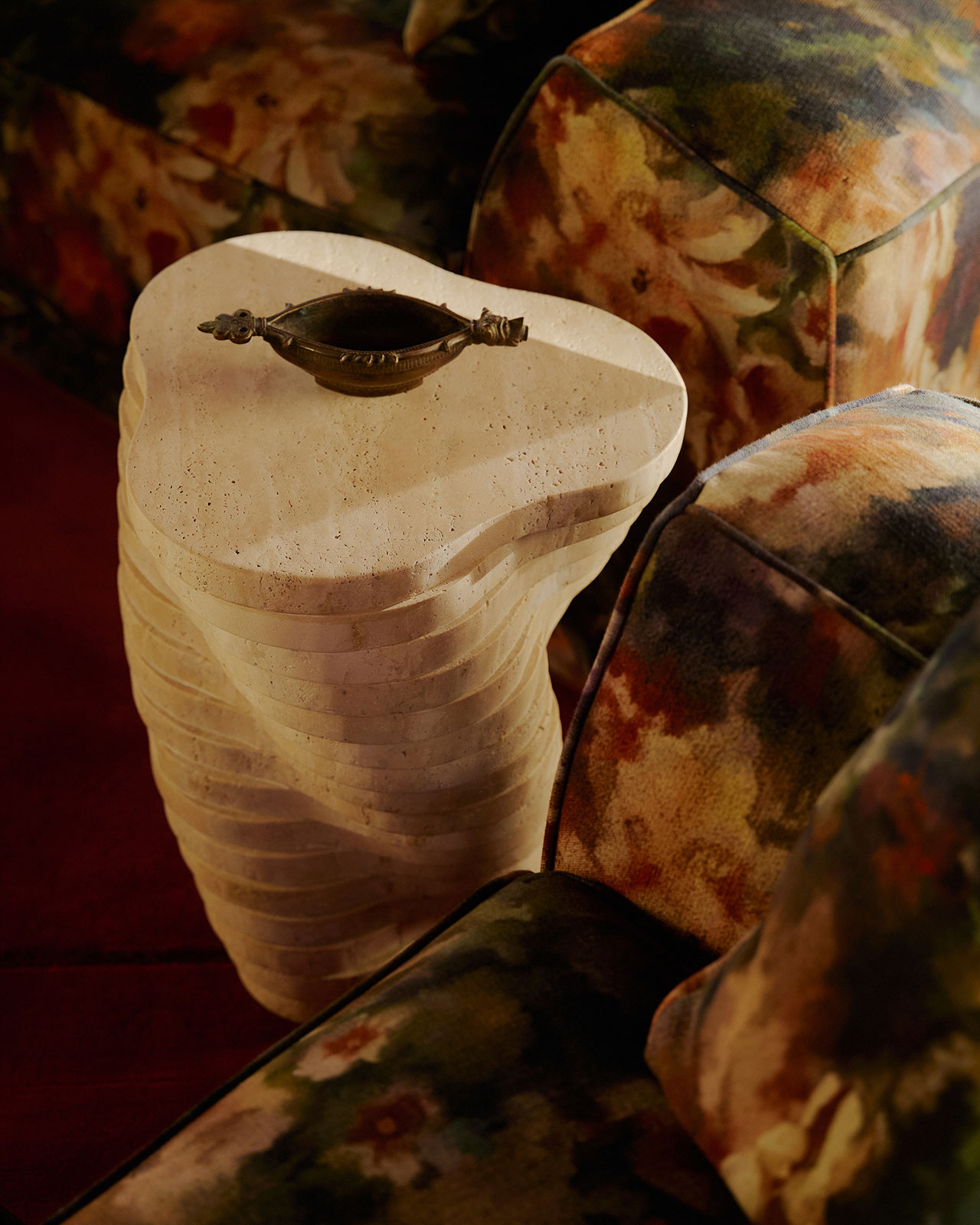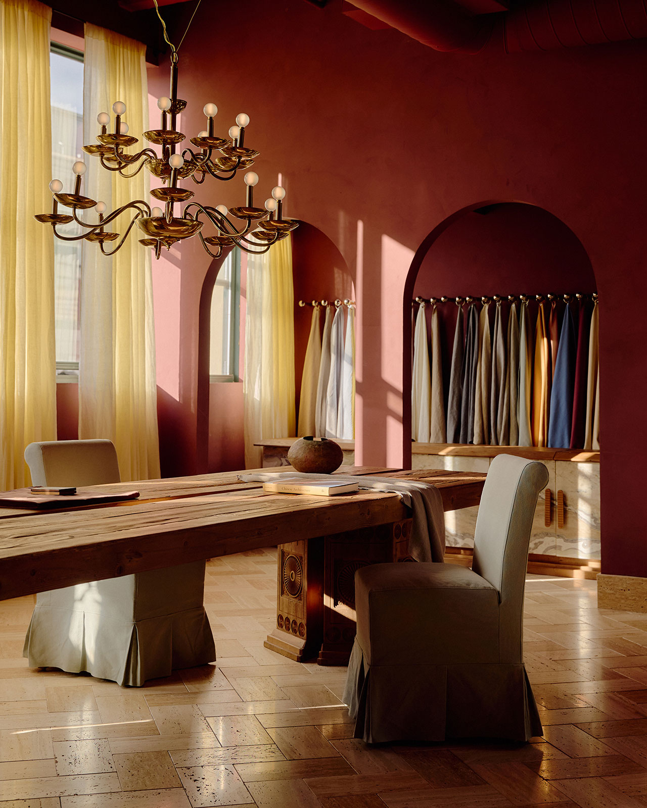 The orangey red found in the printed textile covers the walls in an almost stucco-like effect and carries across to subtly ornamented rugs. A dramatically staged lounge gives way to a platformed bedroom accessed through intricately detailed (concentric circle pattern) panel doors.