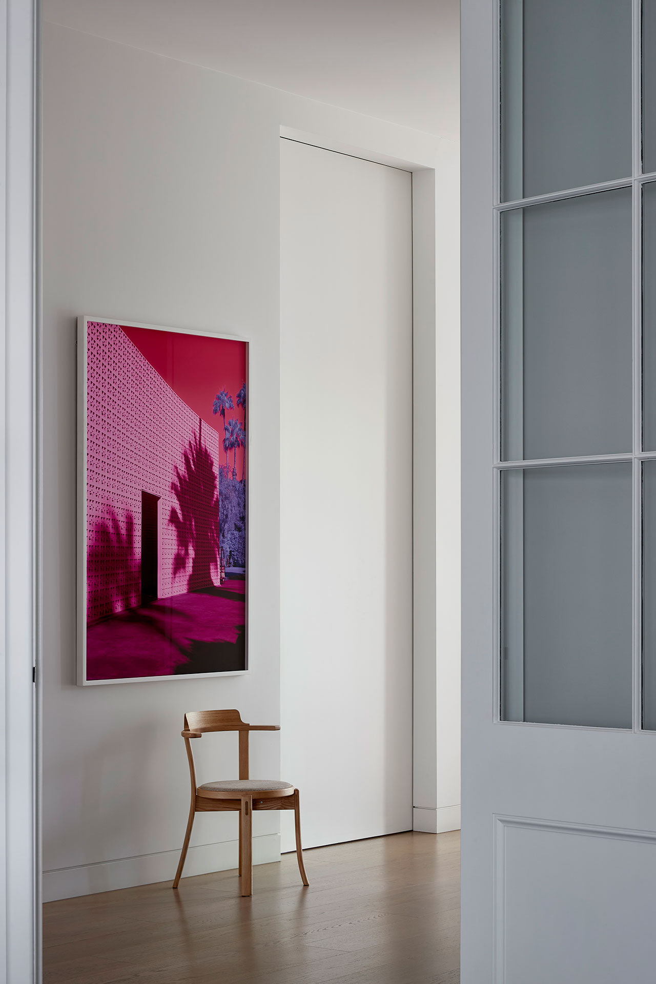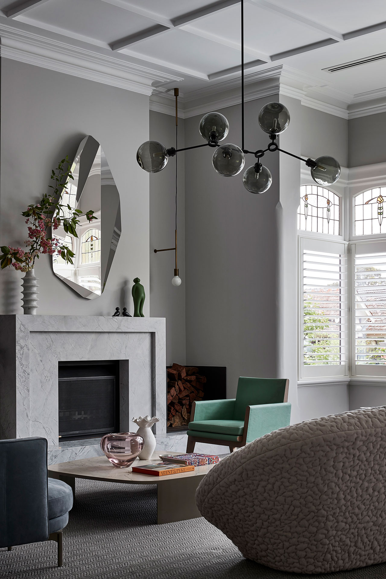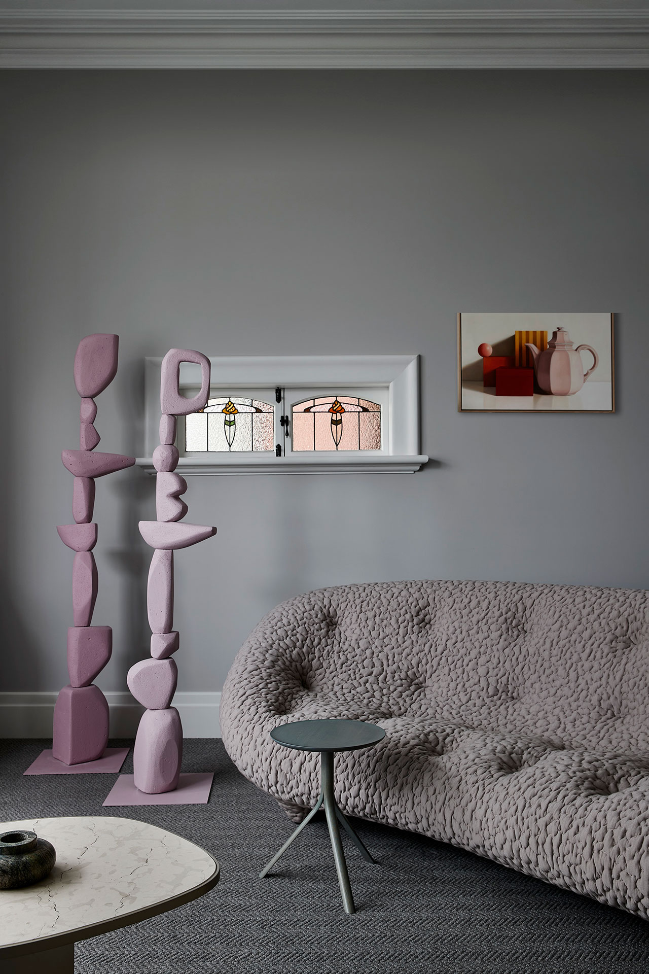 Rather than applying a single palette throughout, Lim choreographed color as a progression. In the original Federation rooms, an elegant warm grey forms a quietly luxurious backdrop respectful of the home’s heritage proportions and formal use. It allows the plasterwork and stained glass to remain legible while creating a calm base for art.