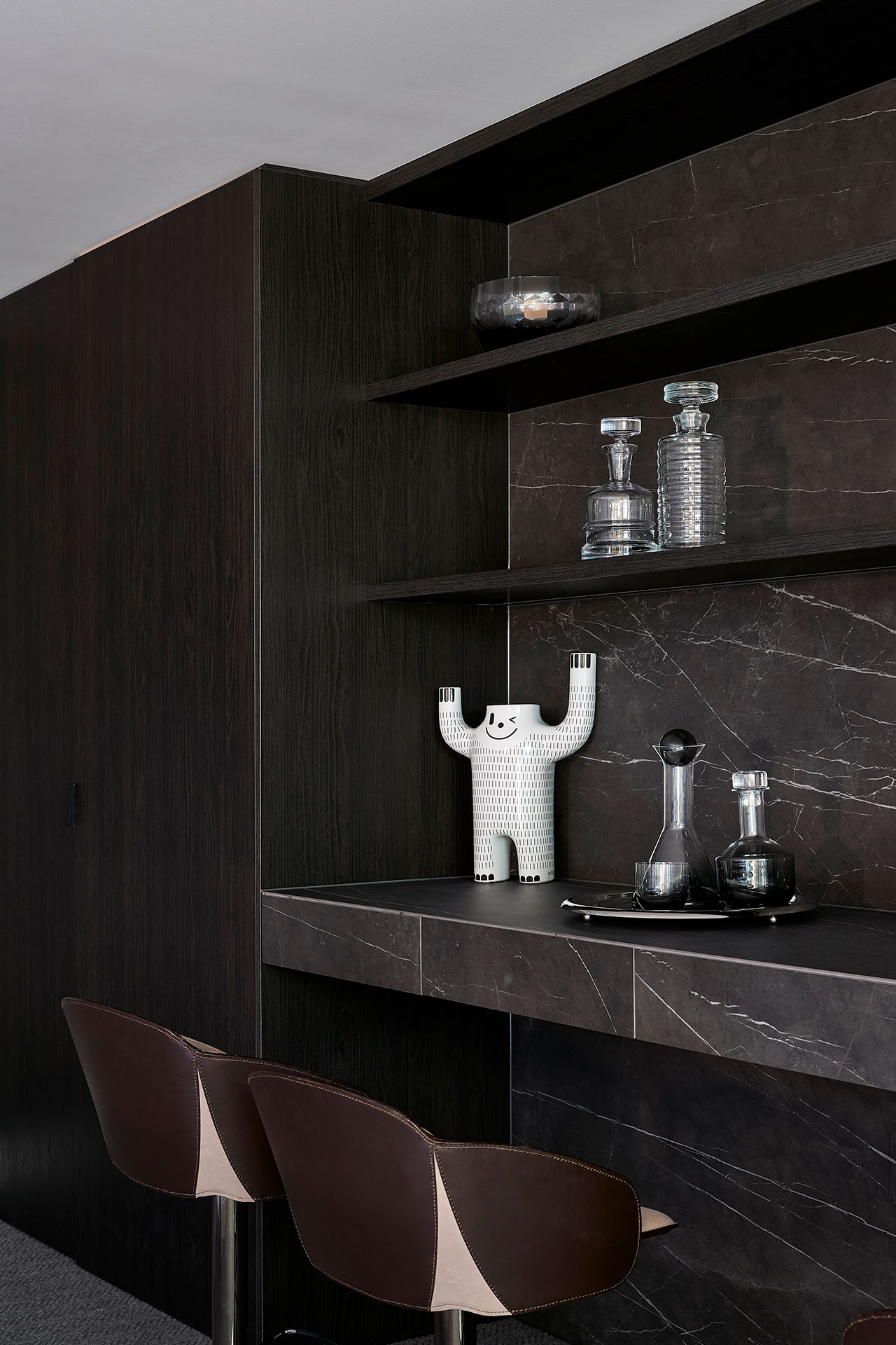 But the grandeur of Federation architecture can easily tip into stiffness. The antidote here is texture. Dolomite and pink marble introduce luminous solidity. Cast bronze and brass accents add weight and patina. Light timber and lacquered joinery soften transitions. Velvets, linens, leather, quilted fabrics, and hand-woven tapestries bring tactility and soul. These choices modulate scale. High ceilings demand pieces with presence like large-scale artworks, sculptural furniture, and custom lighting. The architecture allows it, nay, encourages it.