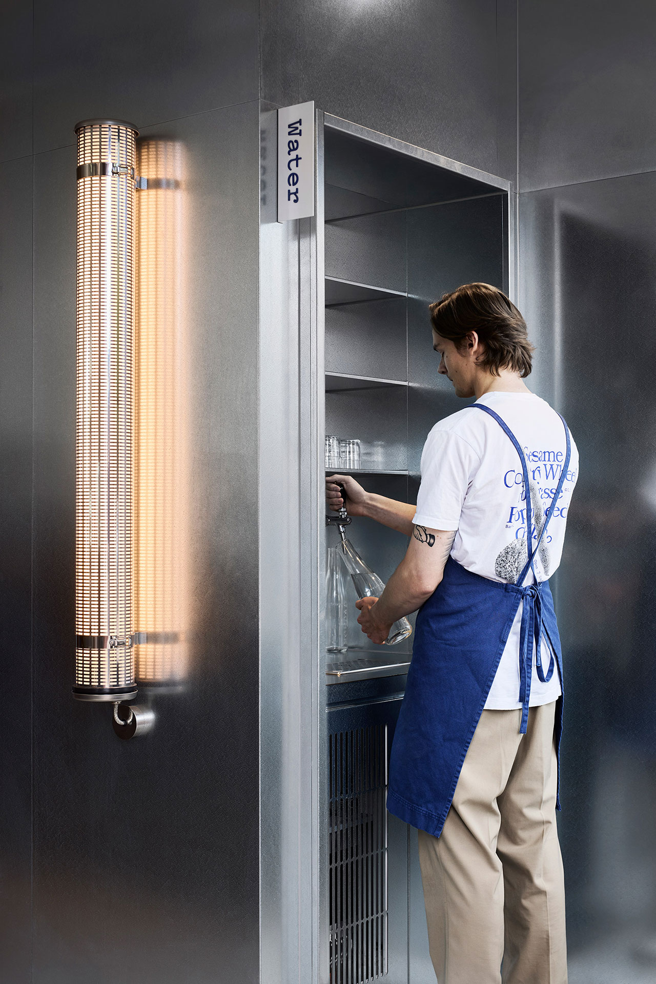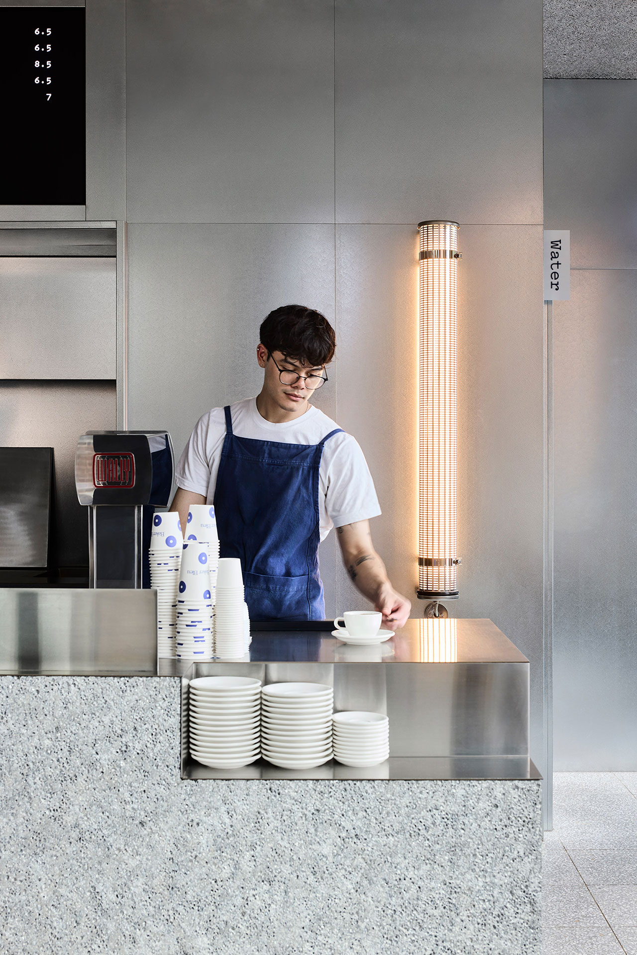 Against the restrained material palette, the graphic identity—developed by Studio Round—emerges with clarity and precision. The neutrality of terrazzo, aluminium, and galvanised steel creates a backdrop where branding can breathe. An integrated digital menu board is framed within the L-shaped joinery wall with a placement that is both functional and compositional.
