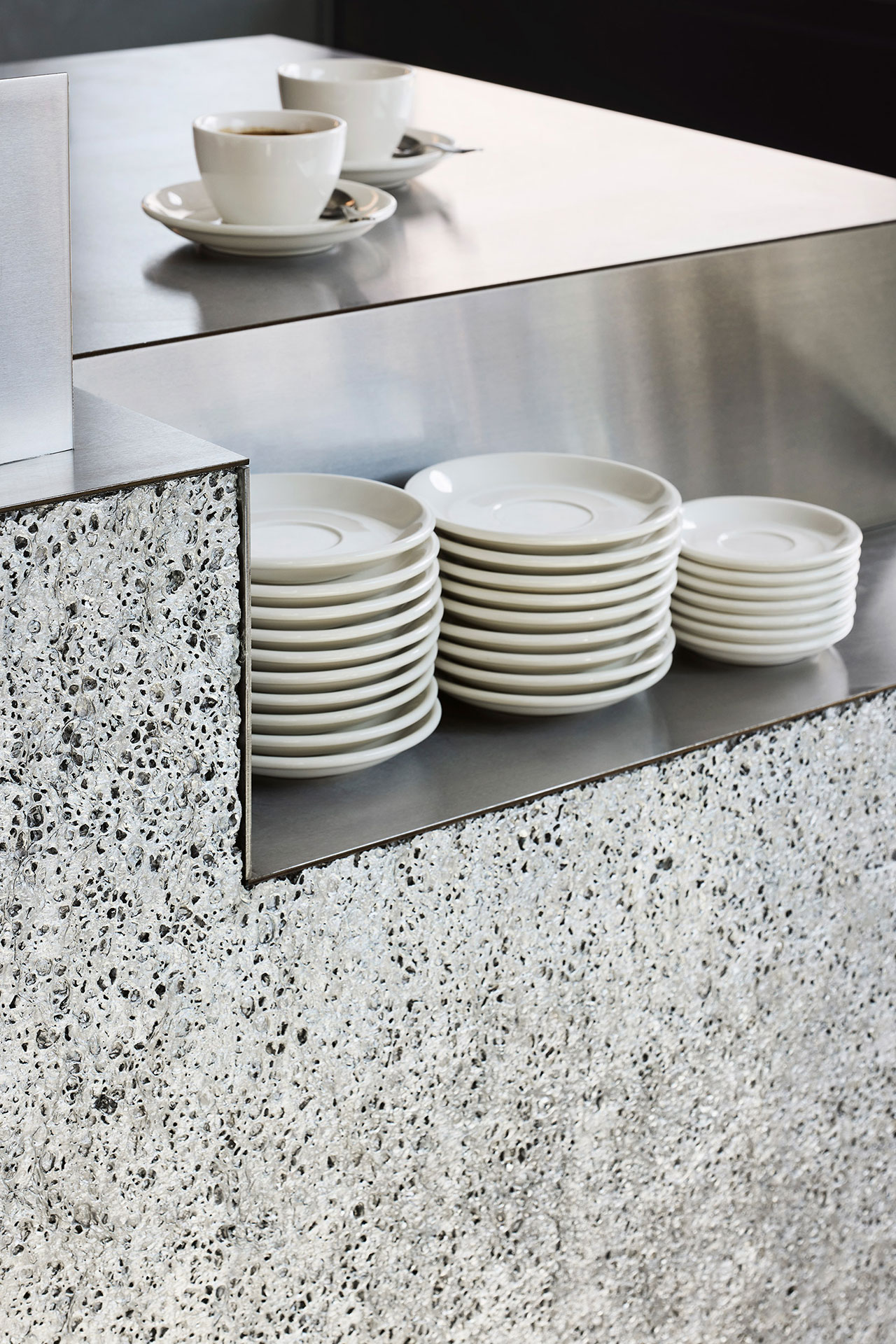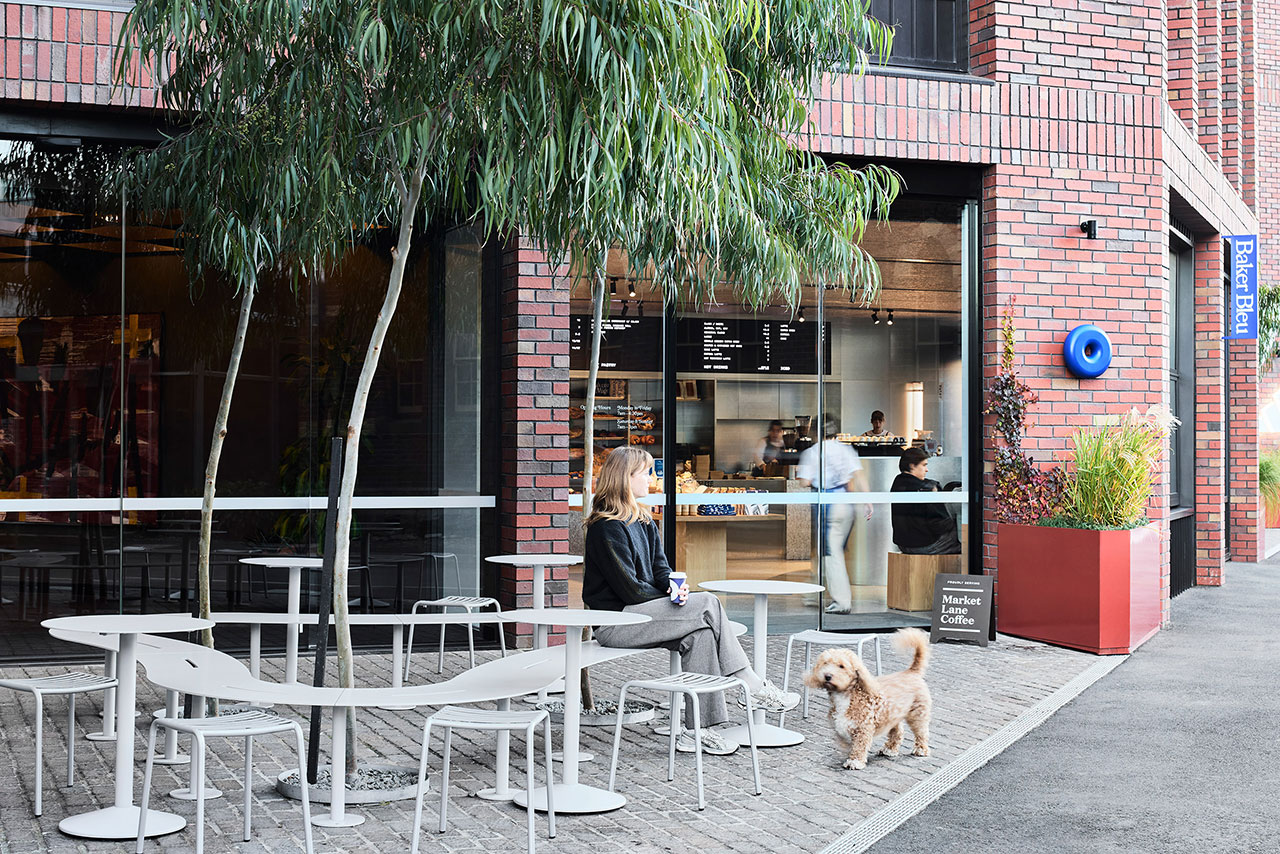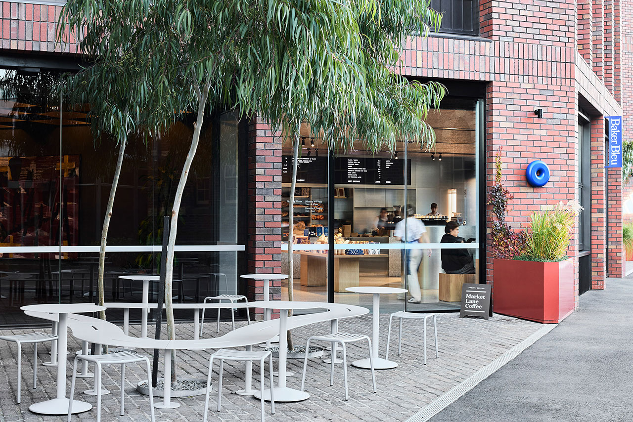 At the heart of the material narrative is recycled aluminium panelling, its surface subtly referencing the alveoli, which are the airy cavities formed during sourdough’s three-day fermentation process. The metaphor is both poetic and pragmatic. Composed of recycled content, the panelling reinforces Baker Bleu’s broader commitment to sustainability while embedding meaning directly into the walls and ceiling. The material wraps upward, lining the ceiling plane and softening acoustics, while exposed services retain an industrial frankness. In this way, the architecture quietly tells the story of how bread is made through texture, repetition, and atmosphere.
