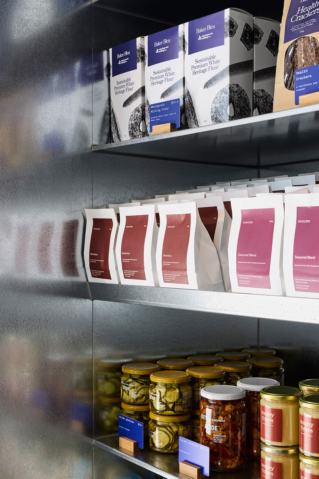 From the outset, the bakery was conceived as a stage for bread-making. The contrast is deliberate: raw, gnarly loaves set against a monolithic, reductionist backdrop. A textured aluminium point-of-sale rises to meet a polished stainless-steel counter, punctuated by baked goods meticulously arranged. Even angled shelving and peg displays reinforce the ritual of handling––each loaf lifted, turned, and passed across the counter with care.
