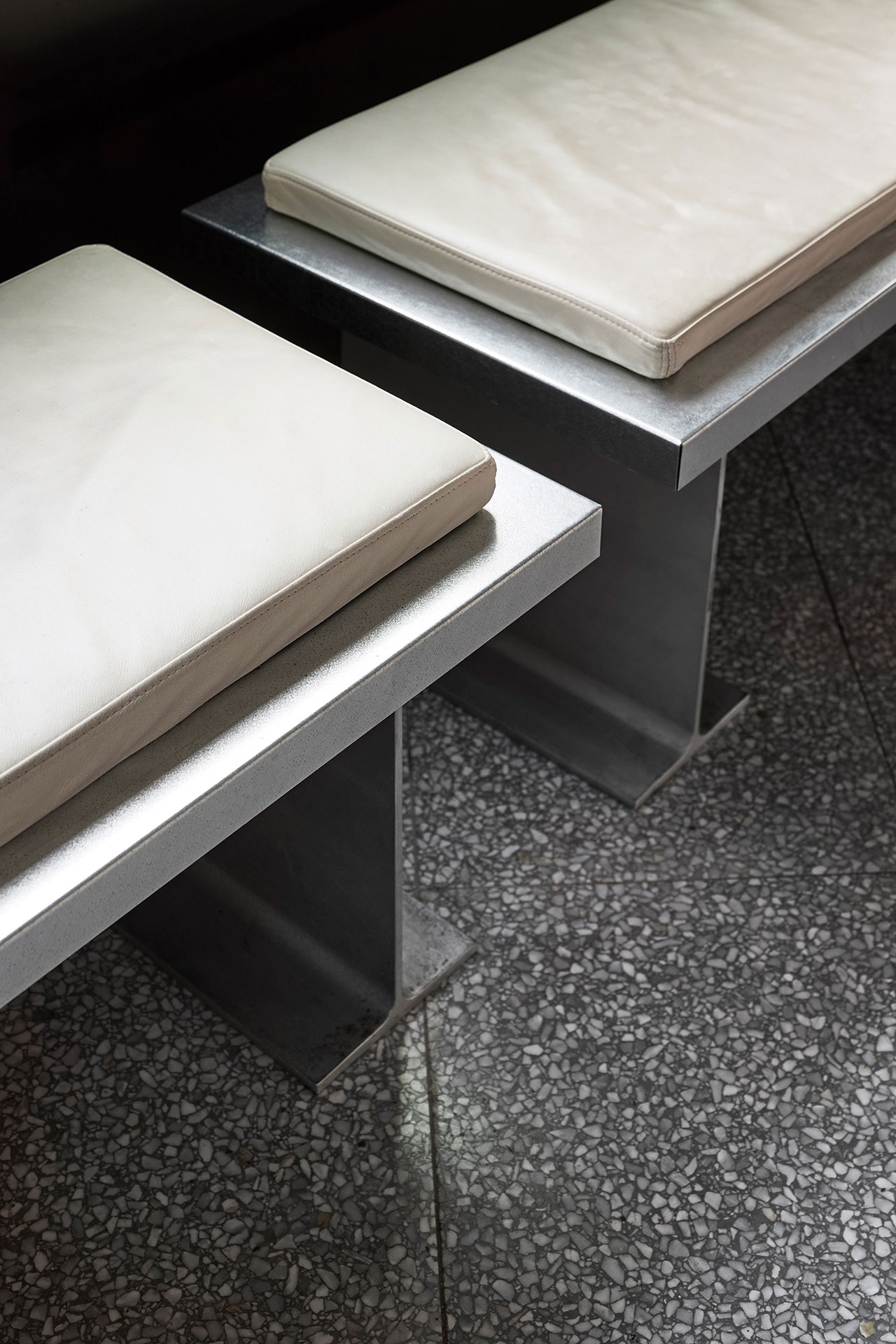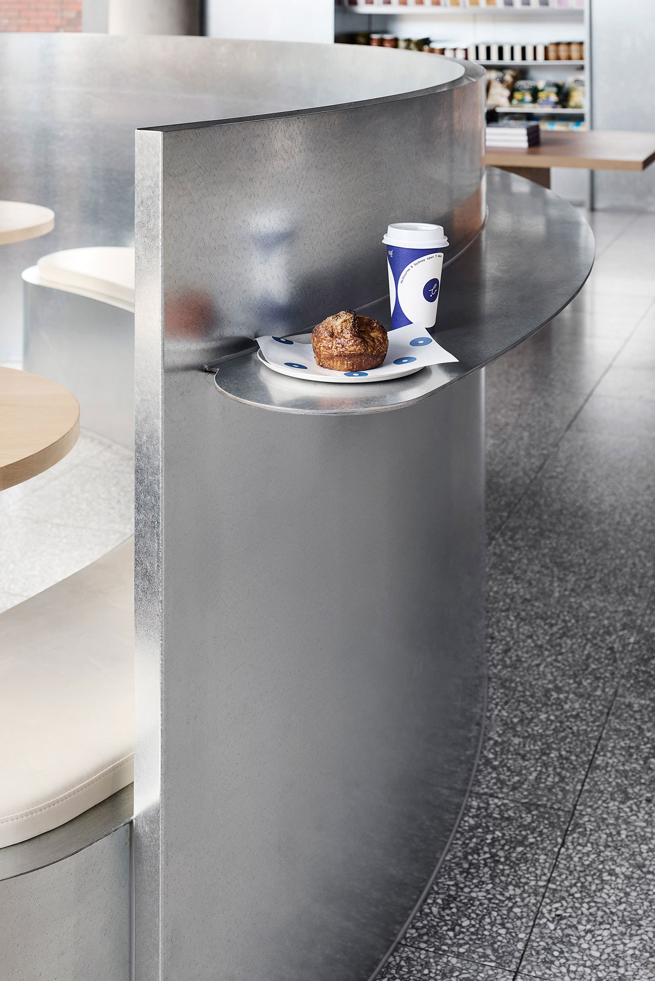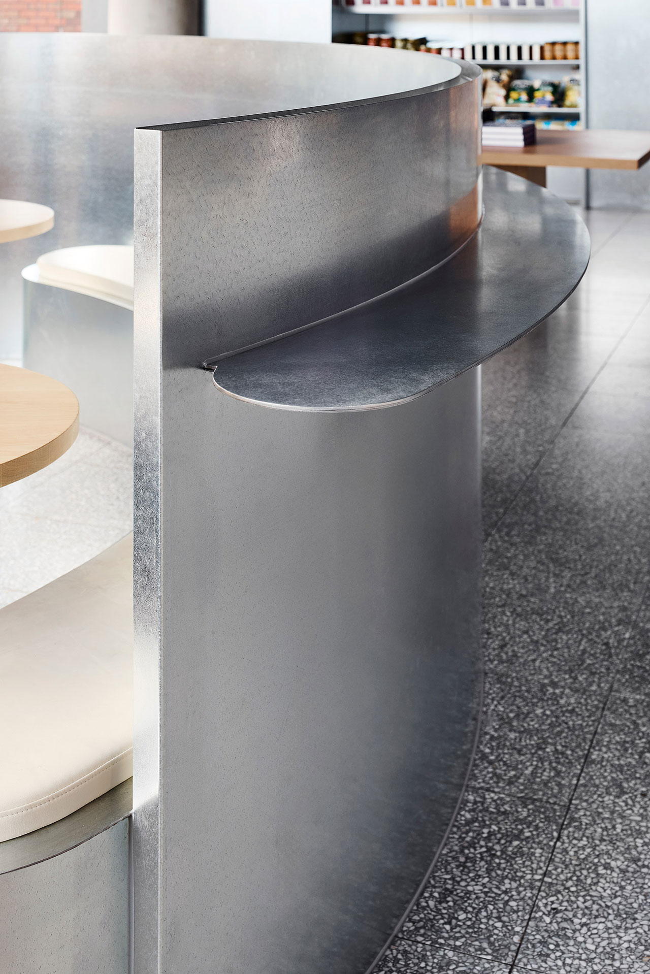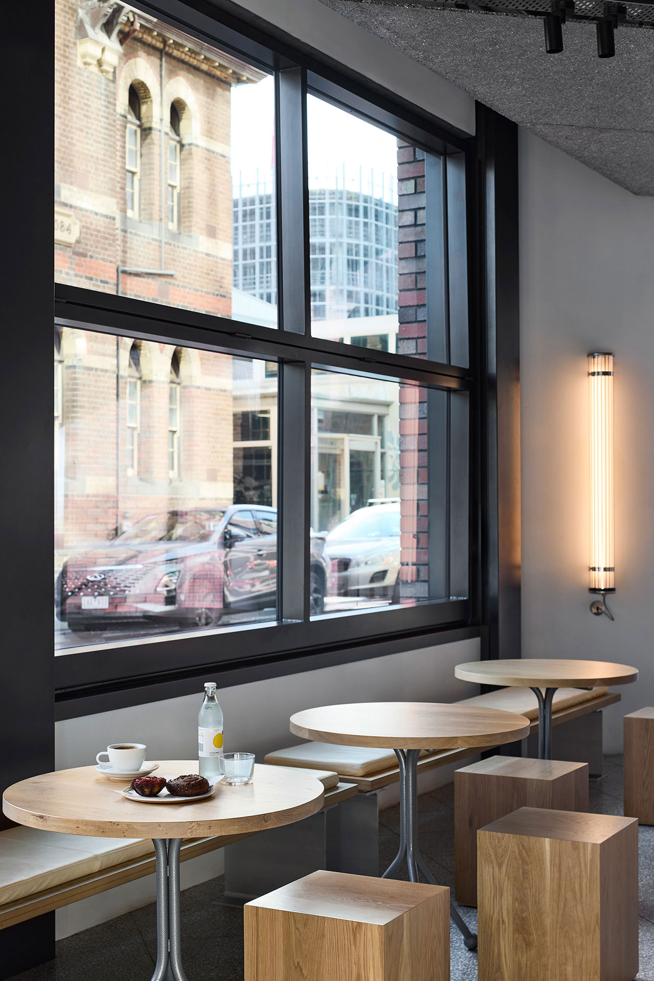 Where movement dominates the retail zone, stillness is carved into the seating alcove. Awning windows open onto the street activating the frontage and allowing the city to bleed into the café. Folded galvanised steel bench seating rests atop a structural I-beam base, while a curved banquette doubles as both espresso bar and café seating. Timber stools and American Oak tabletops soften the industrial palette at touch points to allow for warmth.