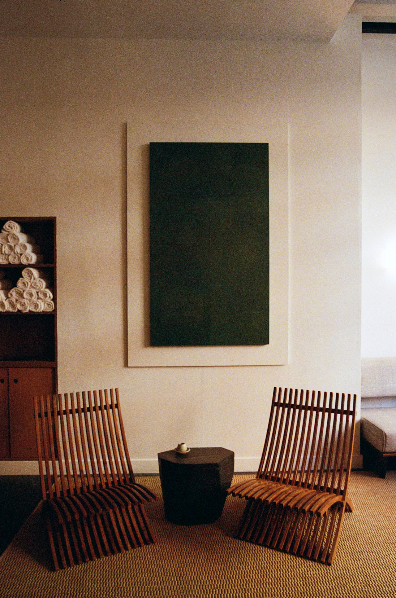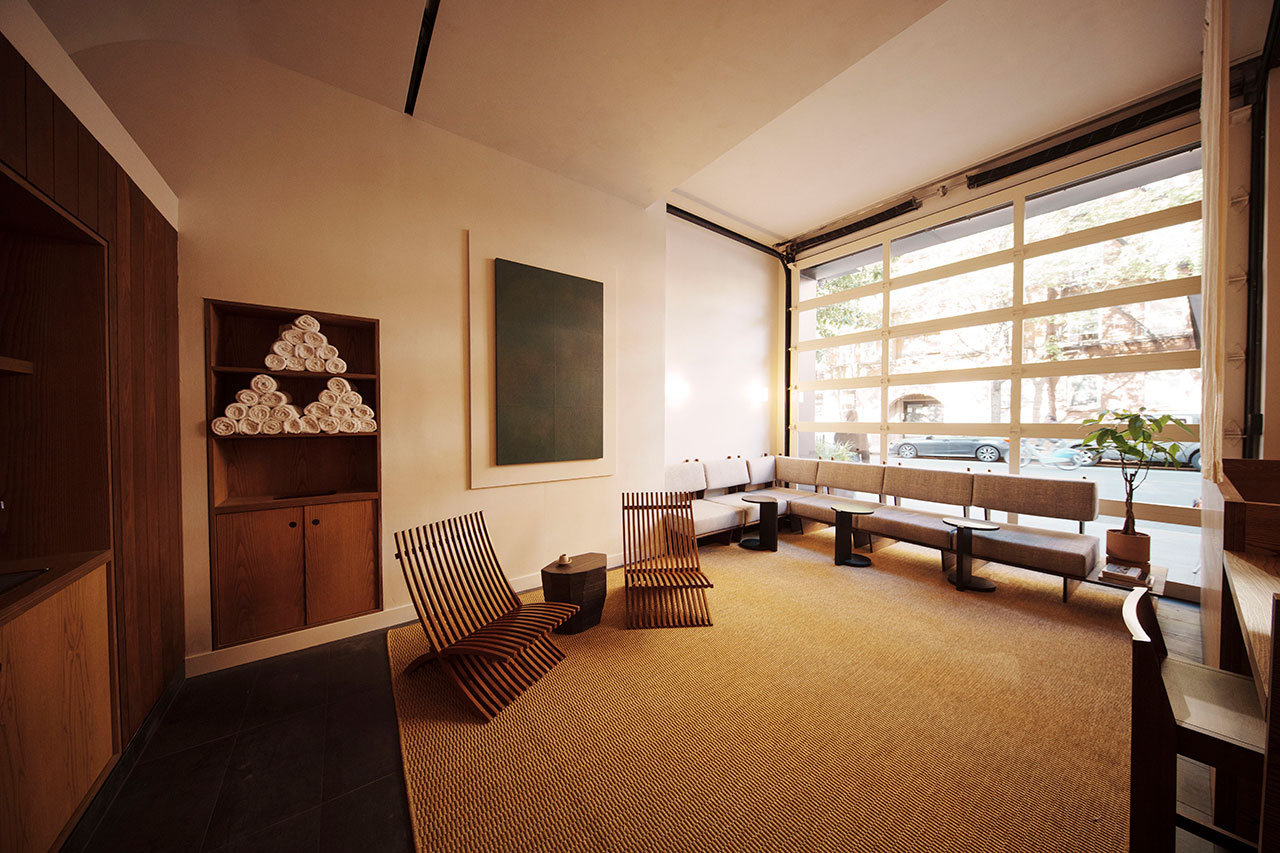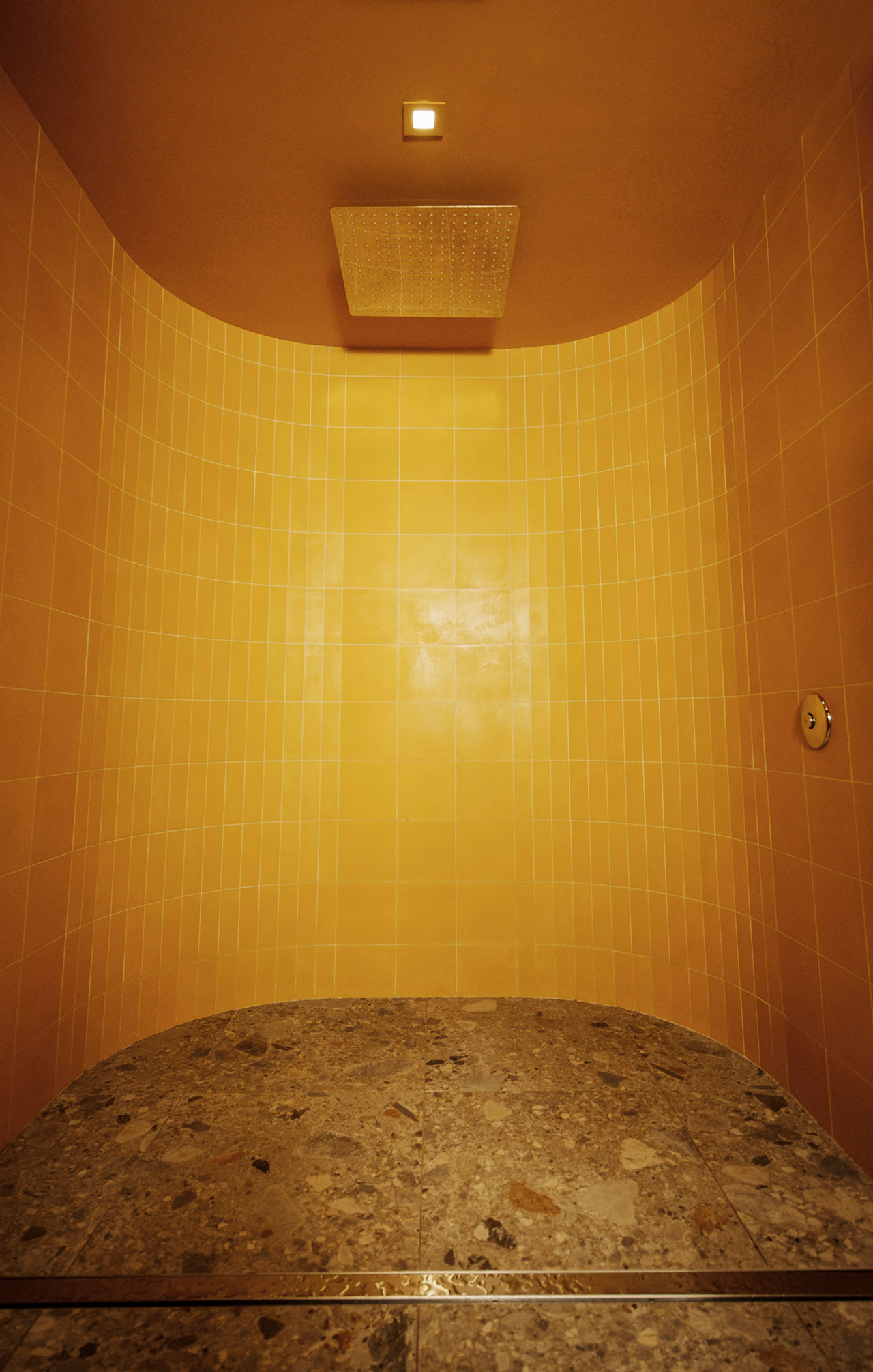 International architecture firm Stroop Design staged the latter with intentional detailing. The aim was not to overpower the restorative act of saunaing with bold finishes or sculptural elements but to succinctly facilitate the experience with a consistent design vocabulary. Many of these accents—2 by 2 inch light green tiles—harken back to traditional sentōs. Tabletops laminated in washi paper by master craftsperson Hanato Watar were repurposed as wall art throughout.