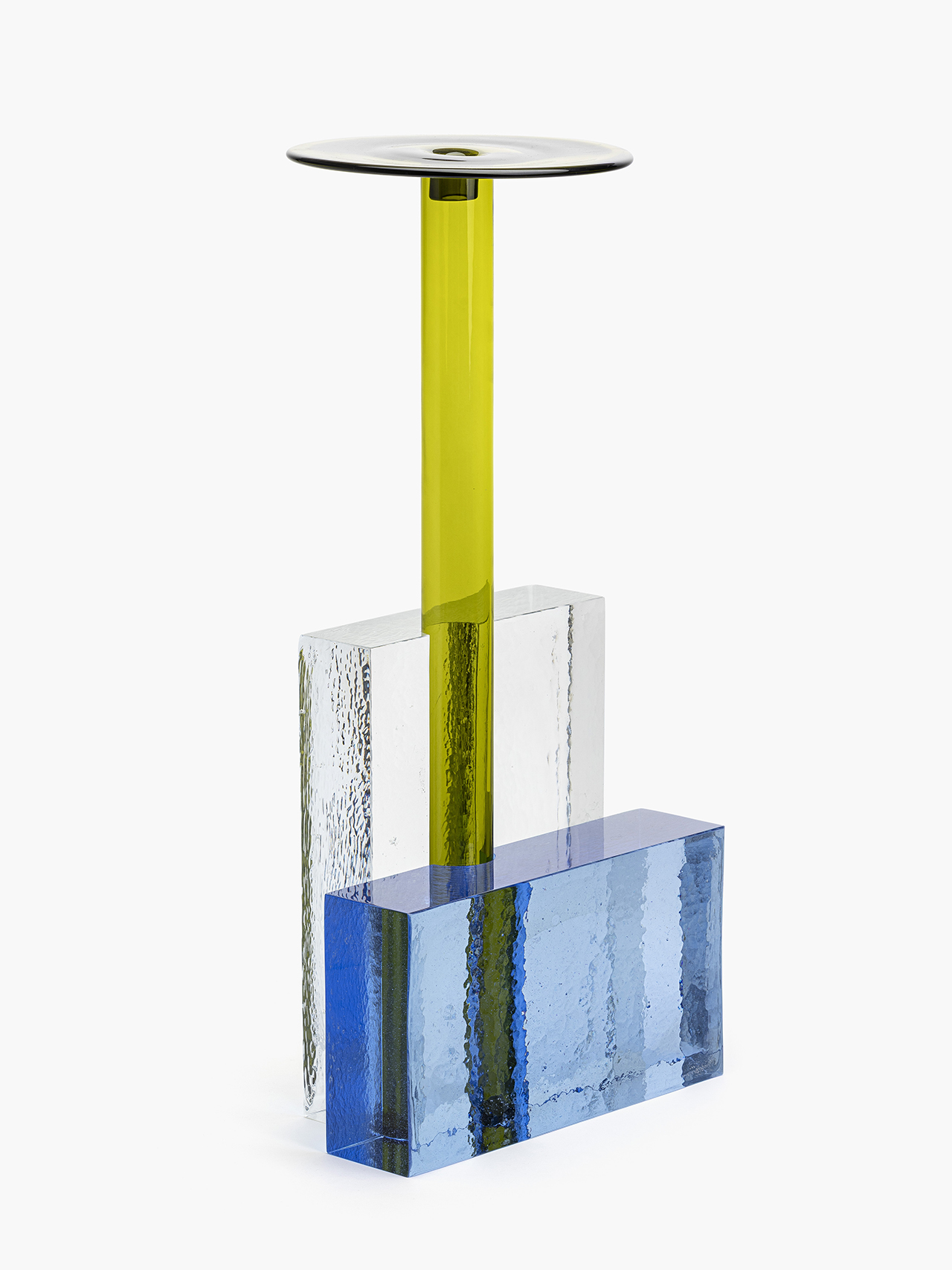 Each vase was composed of four elements: two cast glass blocks––produced in four sizes and two thicknesses, roughly 6 or 7 centimeters––a blown glass tube available in two heights, and a shallow blown glass dish that may be stacked on top. Every component carried its own hue, selected from an eleven-color palette, so that when assembled, colors overlaped and refracted, to produce subtle chromatic vibrations.