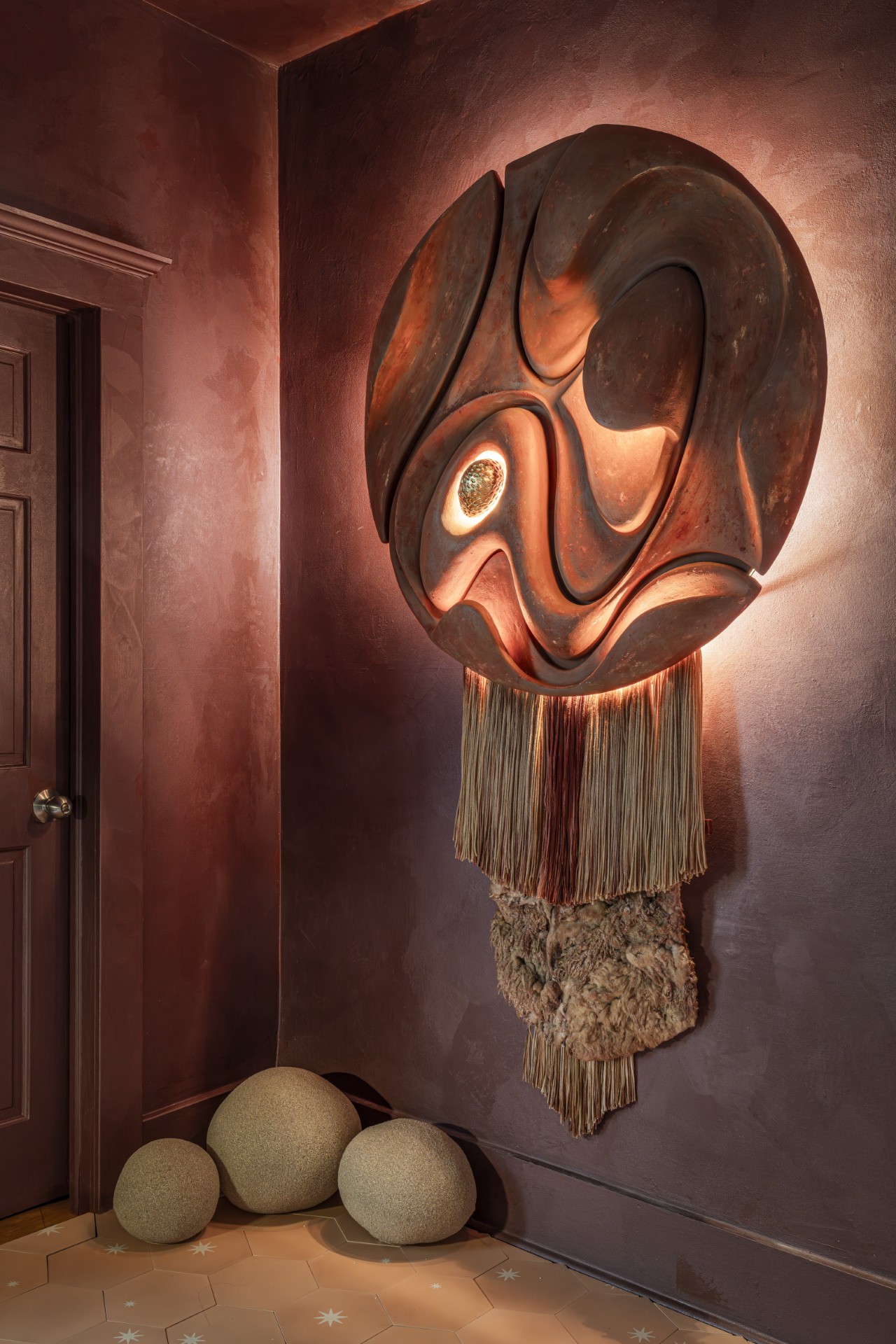 Alia Vitæ reinterprets the sculptural spirit of 1970s lighting through a contemporary lens with the Dora Lamps. Handcrafted from fiberglass and coated in marble and quartz powder, each piece feels otherworldly – a glowing, stone-like form that emits a magical, atmospheric light.
