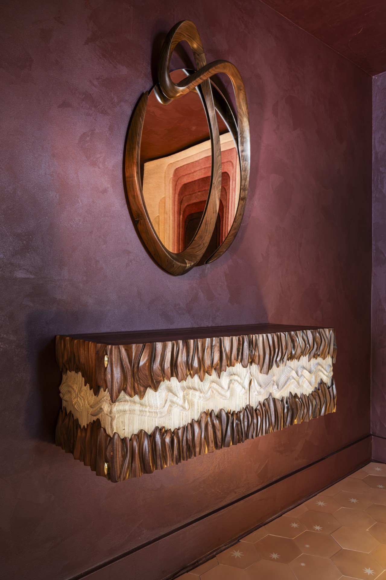 Los Angeles–based studio Amorph’s Saba Mirror gently departs from symmetry before returning to balance, using hand-shaped walnut to explore reflection as both form and feeling. The Nuvia Cabinet conveys a sense of movement through layered wood and embedded sheets of colored paper, reaffirming wood as a living, expressive material.
