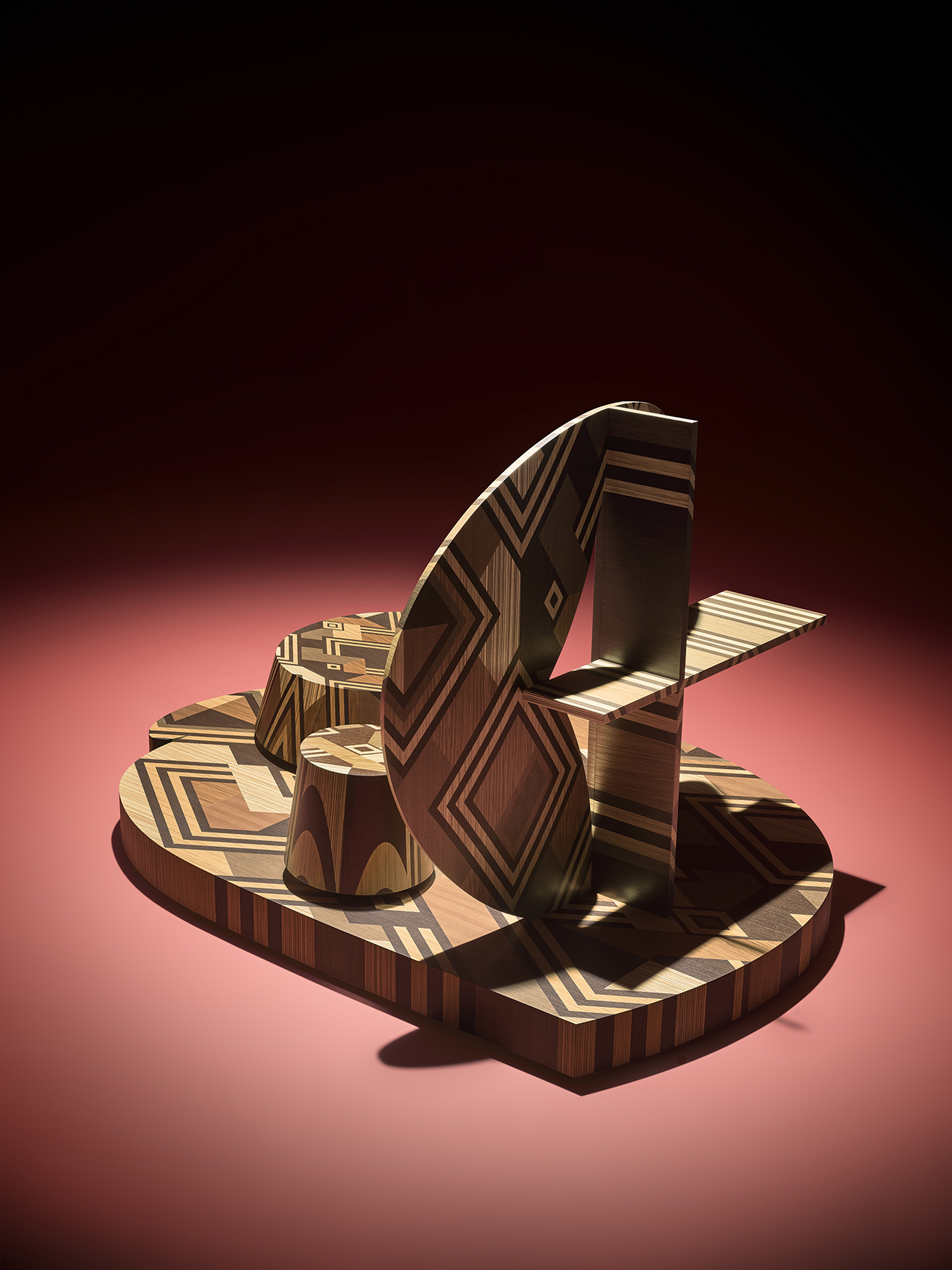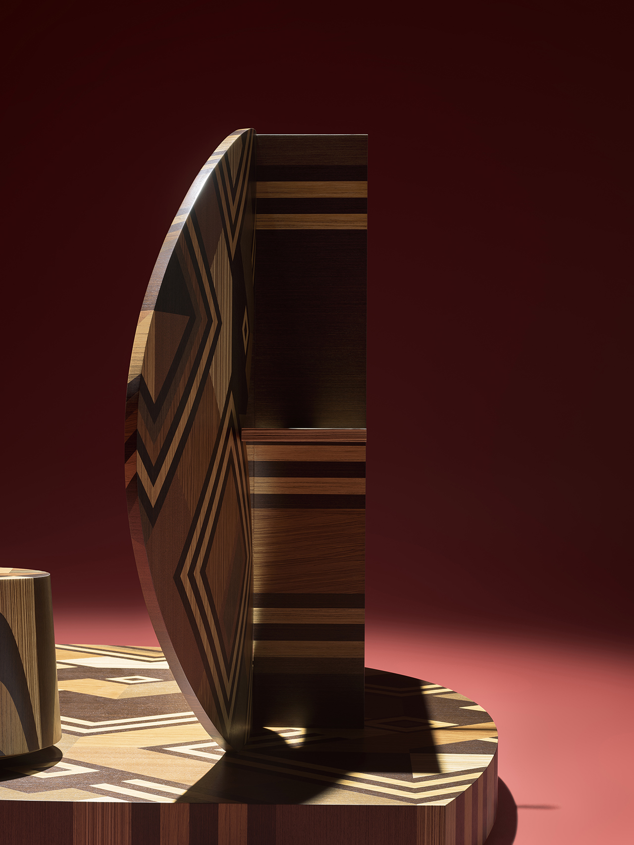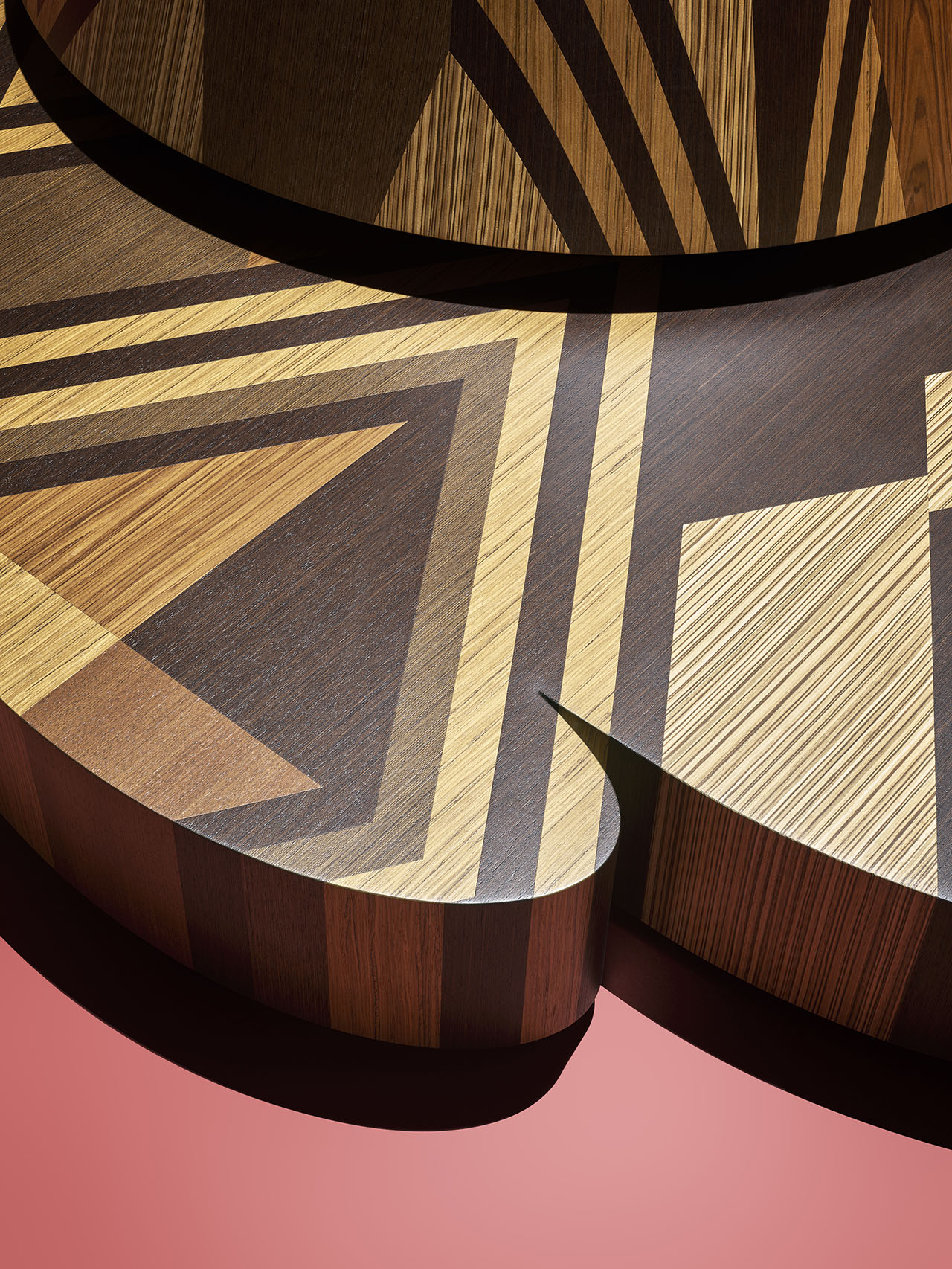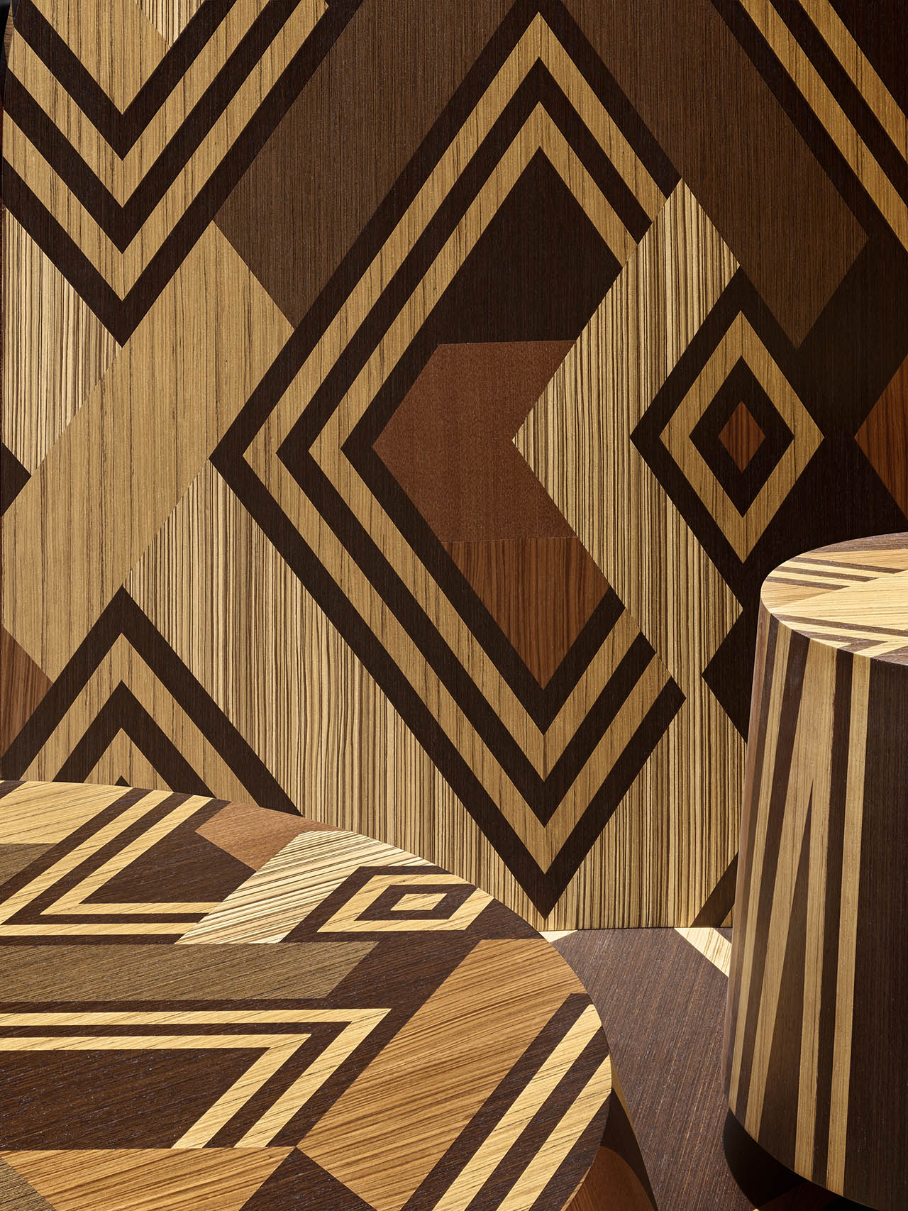 The resulting wood-inlaid pieces – two ottomans and a sculptural partition – celebrate the individuality and improvisational nature of Kuba textile design, realized entirely in veneers from ALPI’s Legacy Collection. Comprising so-called “lost” woods such as ebony, Honduran mahogany, teak, rosewood, wenge, and zebrawood, the collection draws attention to species that are no longer readily available – or in some cases no longer permitted – to be commercially harvested.