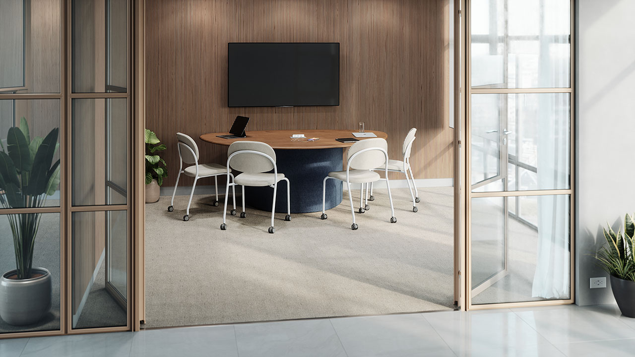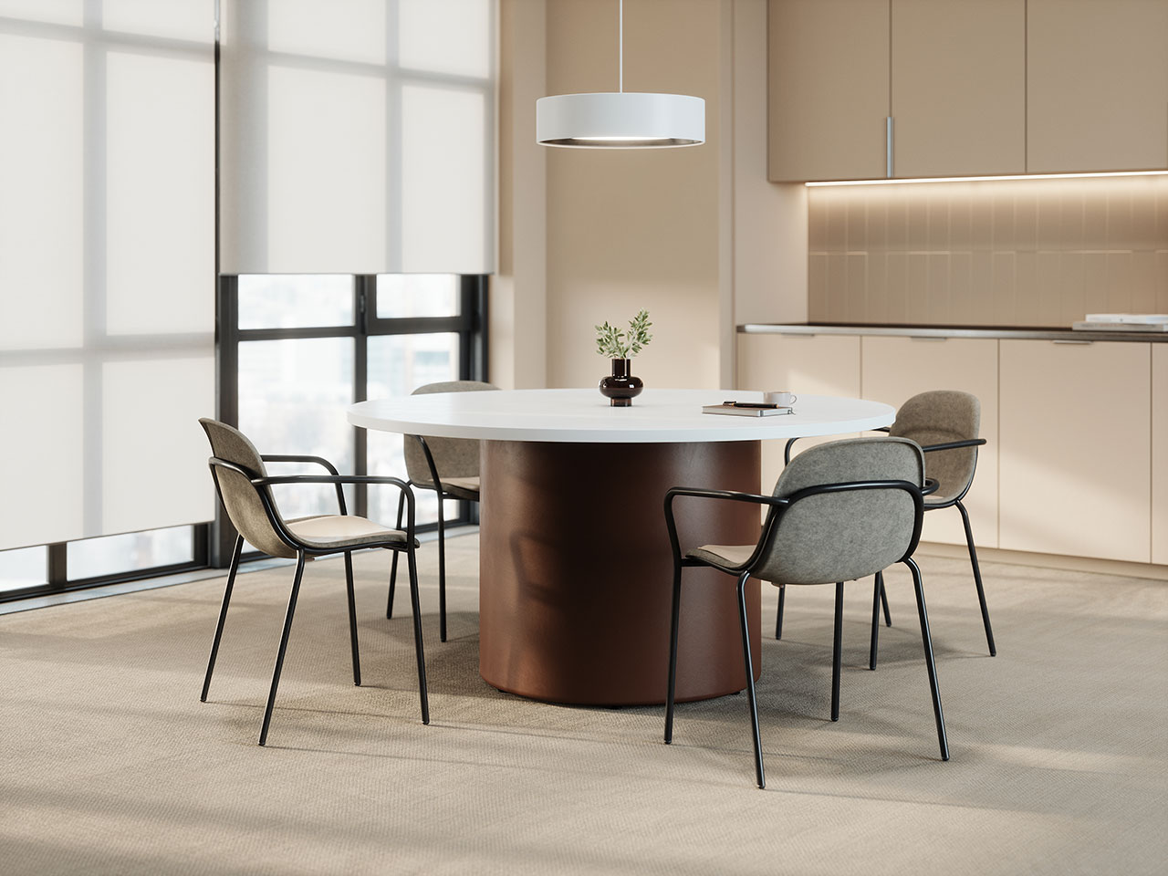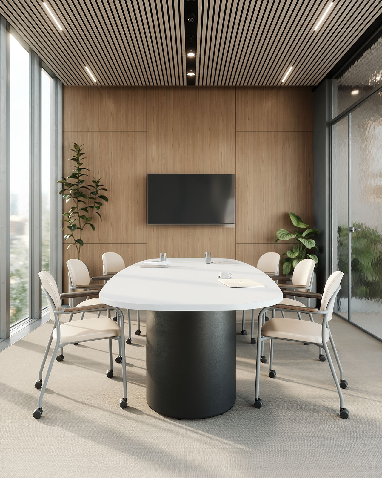 A fully upholstered pedestal base is available in a large selection of graded-in fabrics or COM. This tactile element has an inviting presence that adds warmth to corporate interiors. Specifiers can choose from woven, coated, or leather textiles to complement a range of interiors.