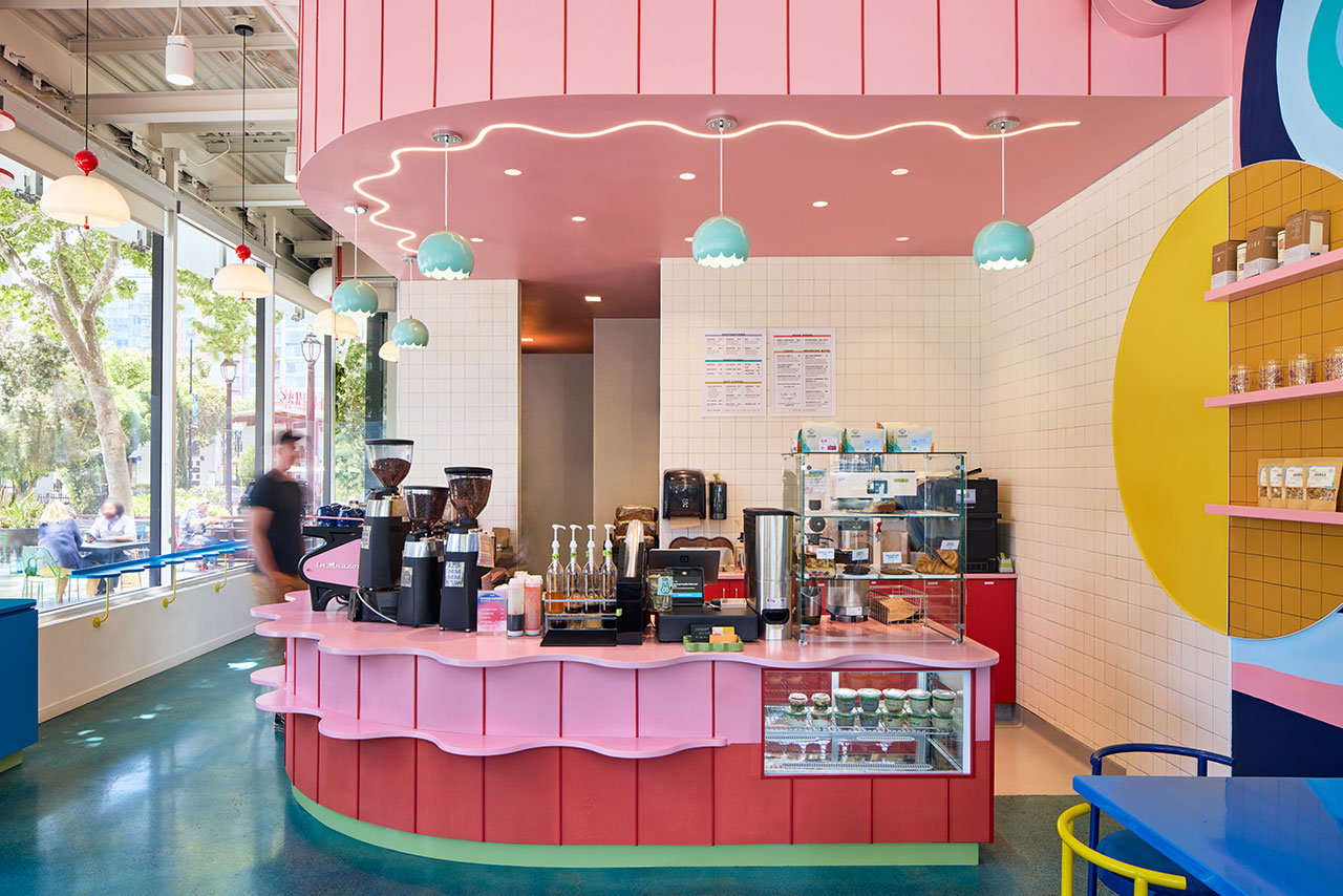 Typical chain java joints are serviceable, but hardly noted for fun, full-tilt design. For Voyager Craft Coffee’s newest outpost, Studio BANAA created a vibrant micro-café with echoes of 1980s Italian Memphis style and Pee-wee’s Playhouse.