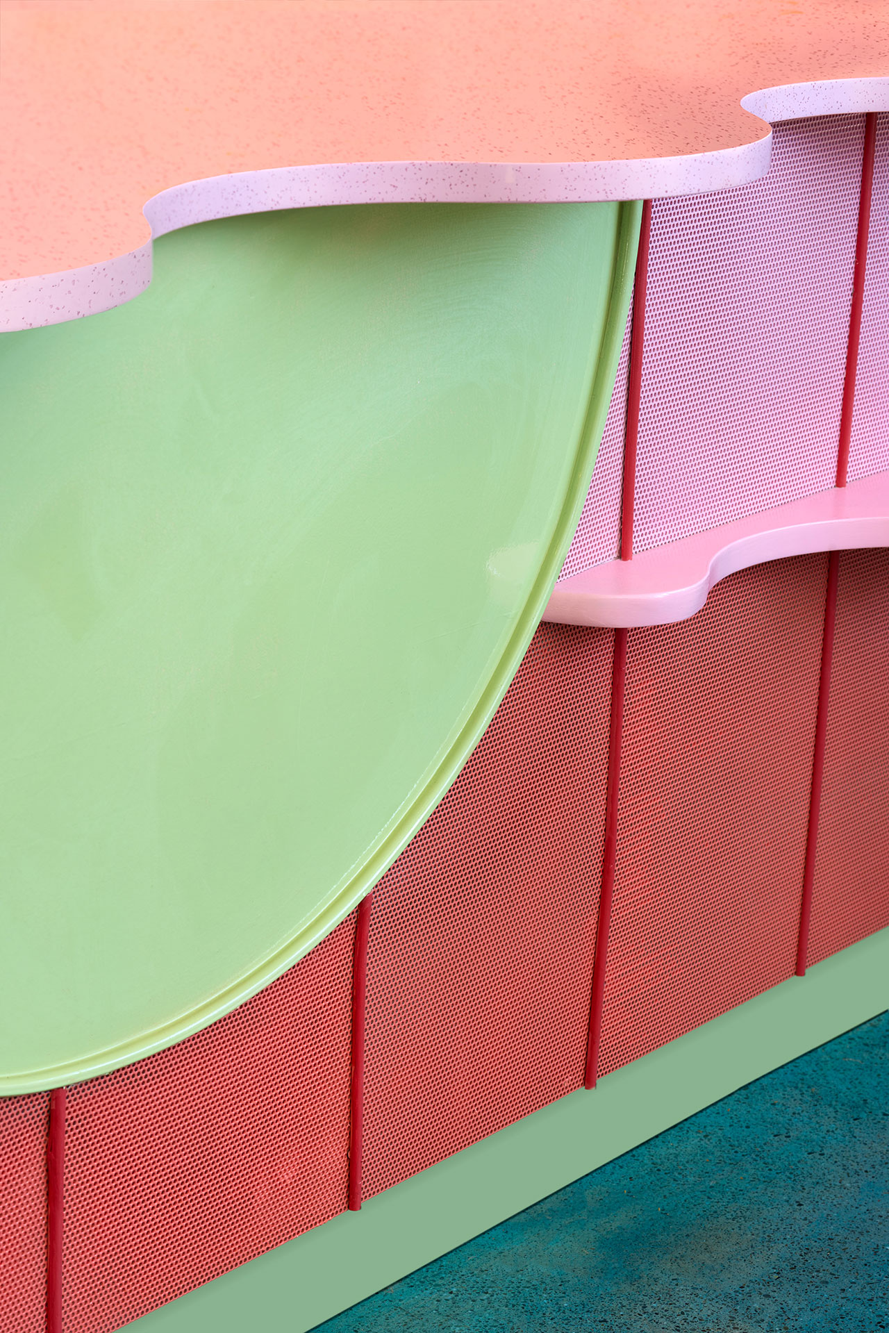 A sculptural coffee bar is clad in pink perforated metal and wrapped with integrated shelving. Its cylindrical, skirted form organizes the circulation for both customers and back-of-house staff, and serves as a focal point. Lacquers and powder-coat finishes not only keep surfaces clean in high-touch areas, they also provide depth within the tight footprint.