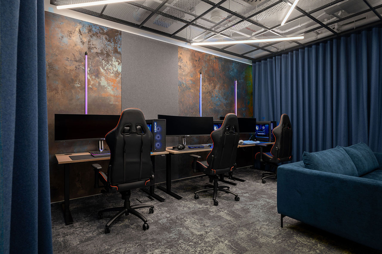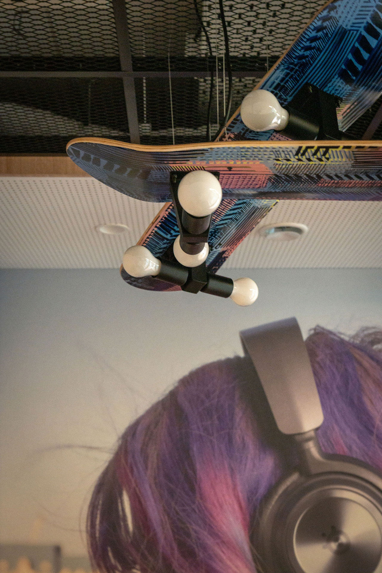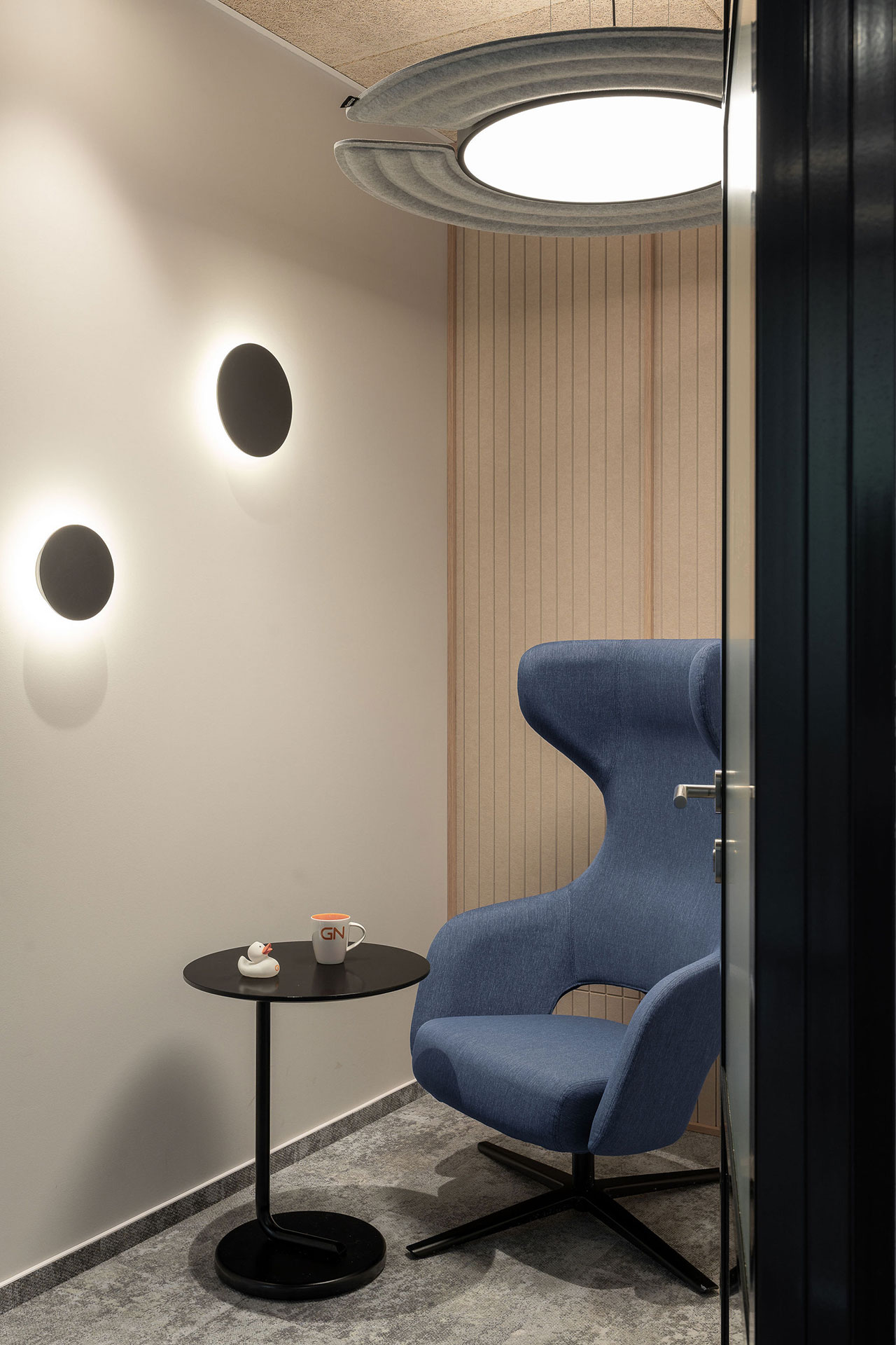So when BIT CREATIVE was hired to envision a branch in Poland for leading Danish audio technology company GN Group, the architects decided to look at items in the core line, from hearing aids to devices for gamers. “The products were really the inspiration for the entire office concept,” says Barnaba Grzelecki, founder of BIT CREATIVE.