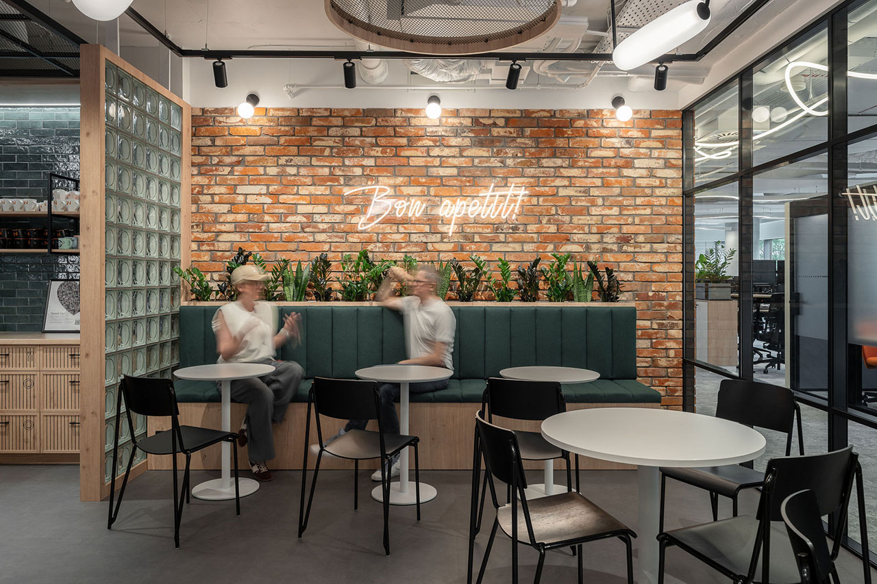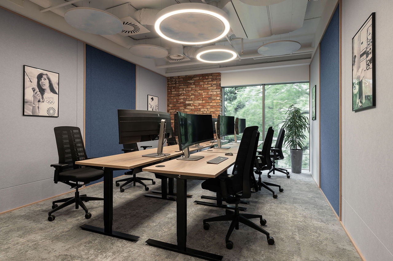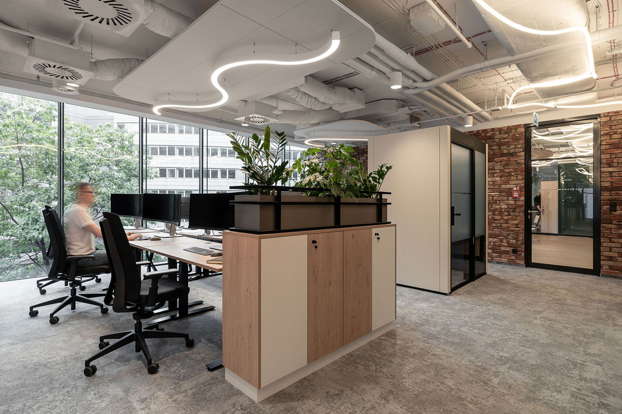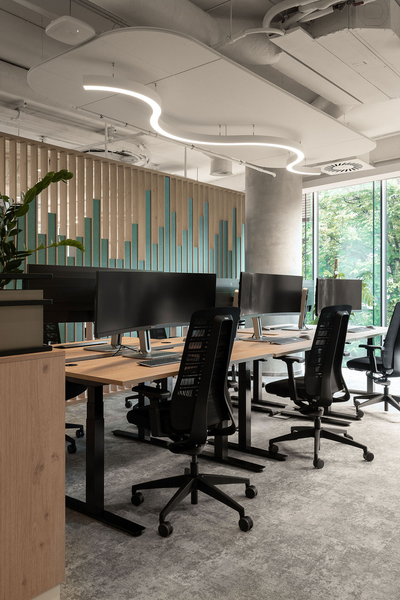 Located in the Saski Crescent complex in Warsaw, the 21,527-square-foot headquarters supports global operations, particularly the organization’s IT department, the largest cohort in the space. Exposed ceilings and tree canopies visible through some of the windows create an expansive feel.