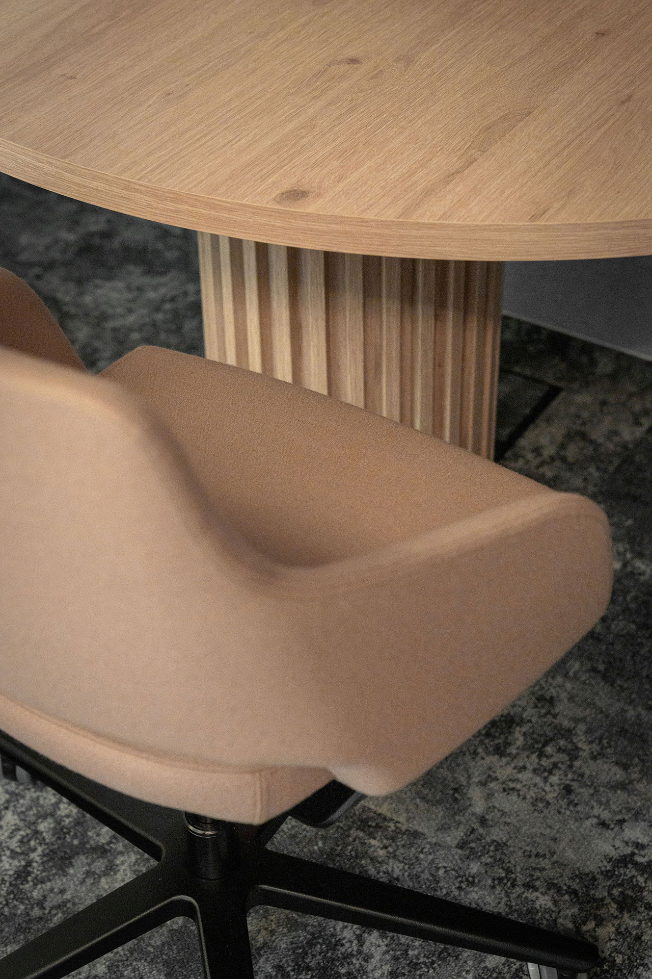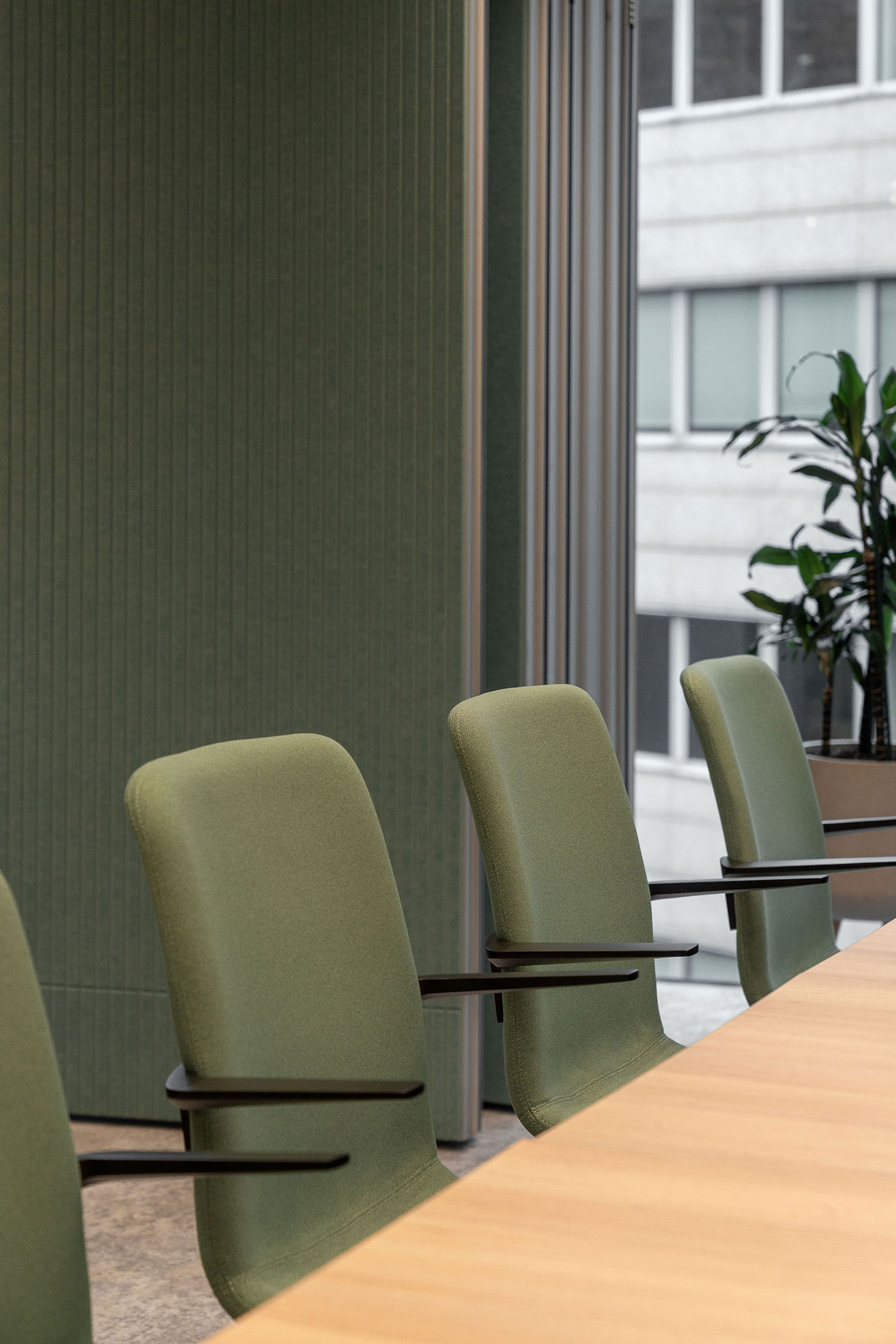 Soundproofing is, of course, at the forefront, with multipurpose pieces that are ideal in the open office. Circular fixtures that resemble origami flowers seem to float overhead. PET panels integrated into partitions reduce noise and offer added privacy. Bitumen-backed carpet tiles bring durability and texture underfoot.
