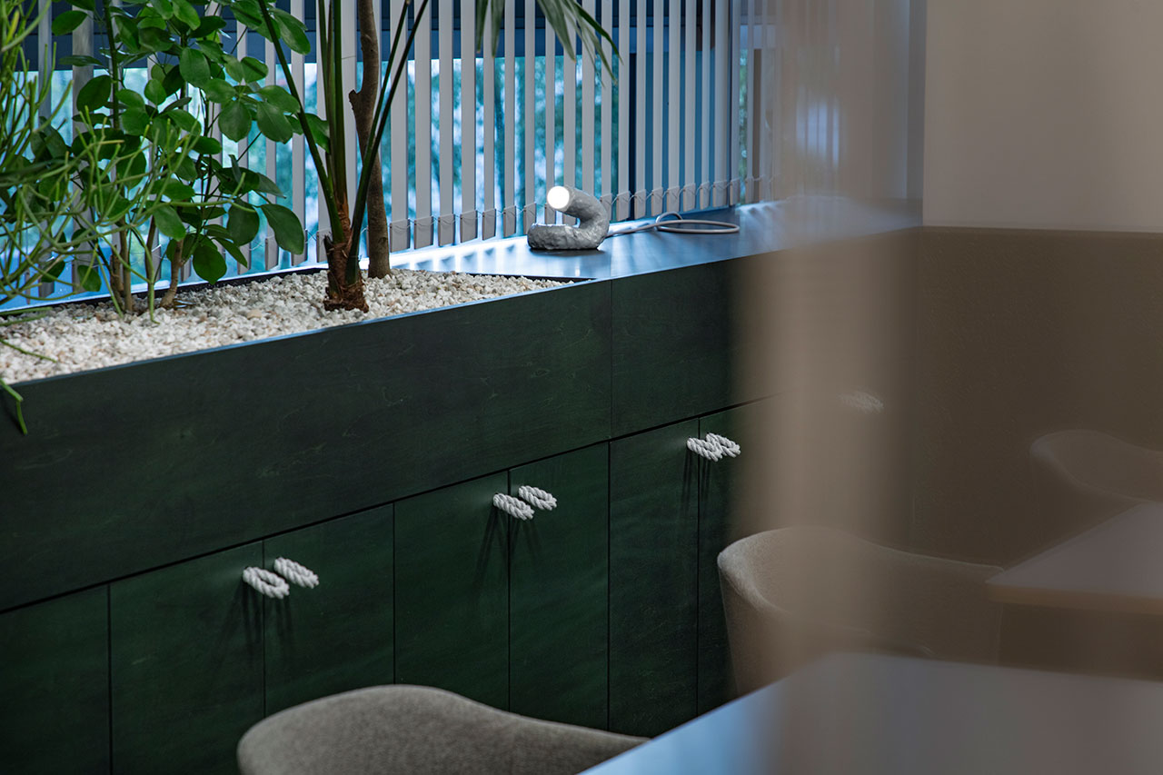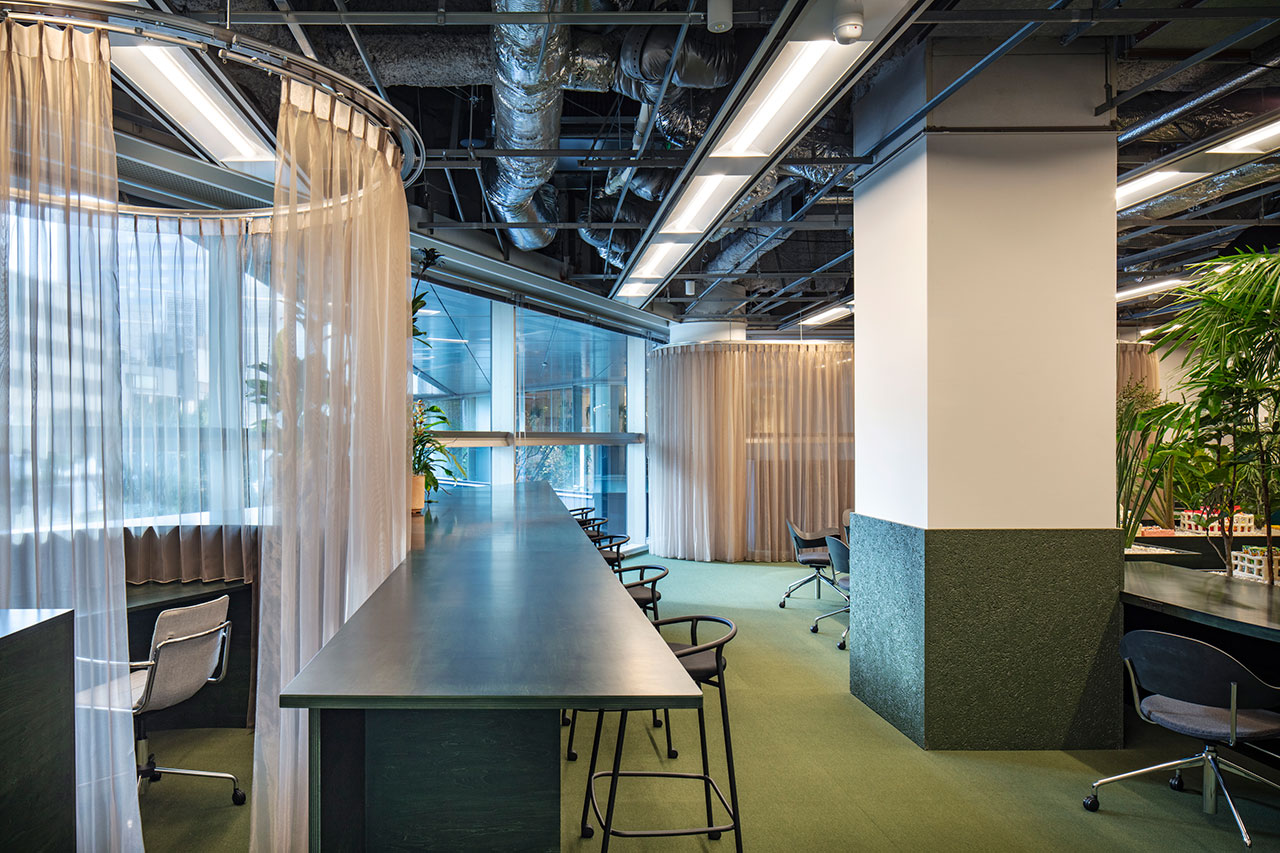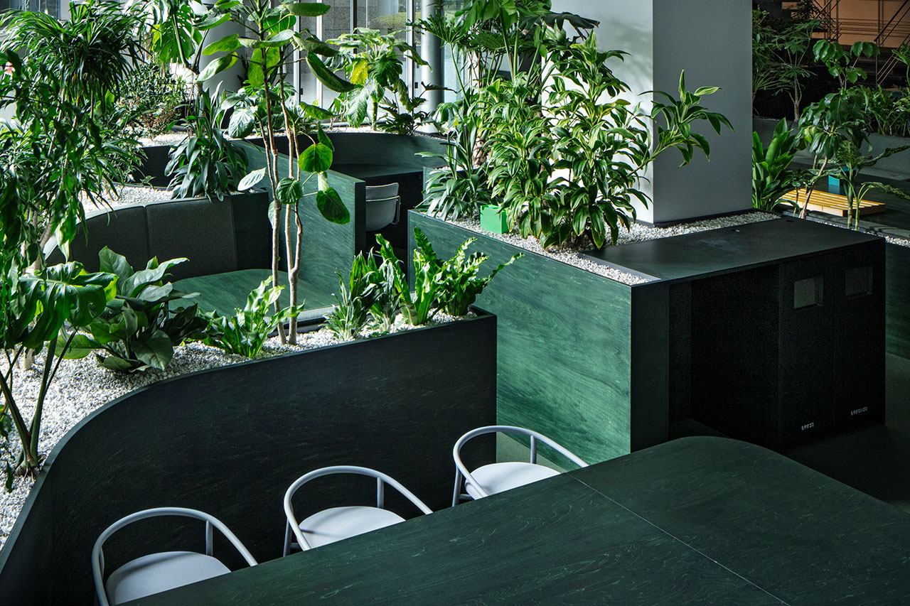 The two levels of the headquarters echo those of a typical eatery. A shared area is on the upper floor, while the lower portion is divided into private spaces for groups. The height of the fixtures, and sightlines, gradually rise seamlessly from the center of the office to the back. Plants double as partitions to offer privacy. Furniture and flooring in green tones complement the flora and add a natural vibrancy.